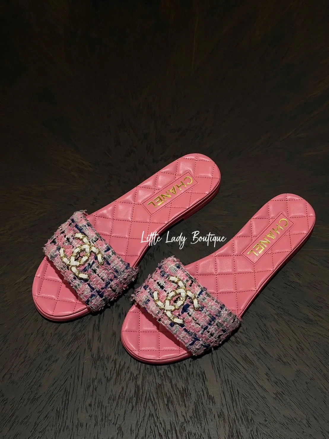 CHANEL 粉/藍毛尼 19白底金屬鍊大雙C 菱格紋 涼拖鞋