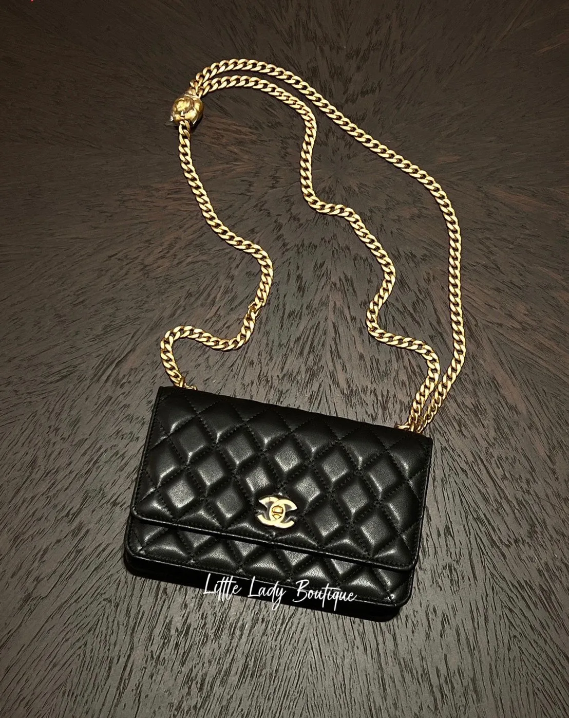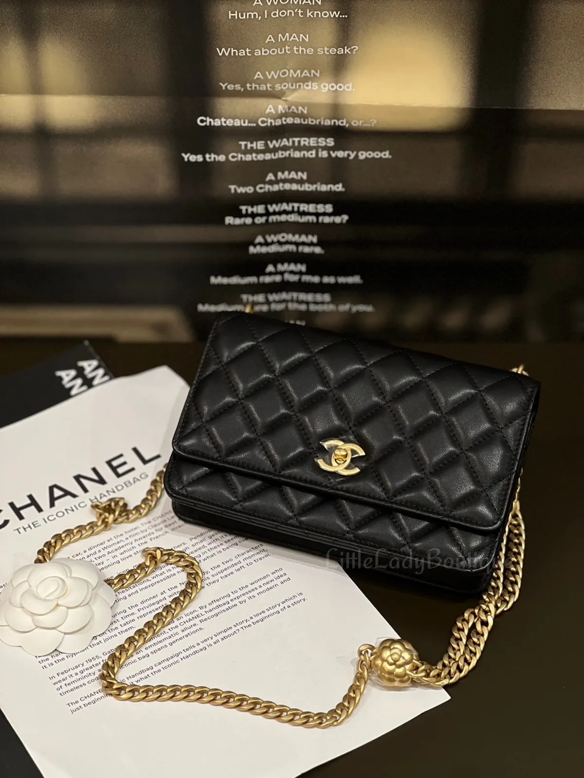 CHANEL 黑色菱格紋金色山茶花釦 WOC