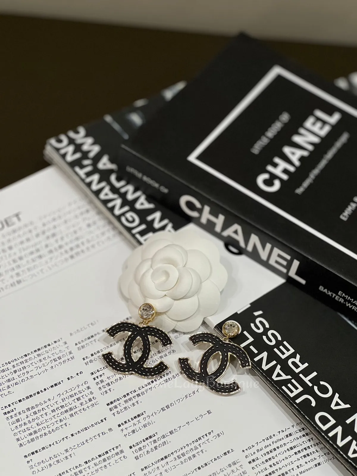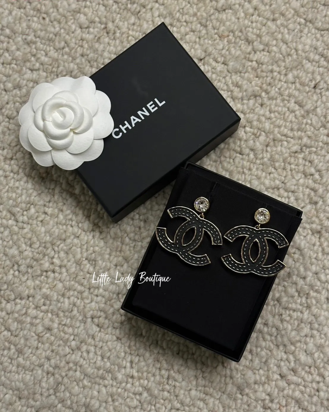 CHANEL 金邊黑色大雙C 水鑽 夾式垂吊耳環