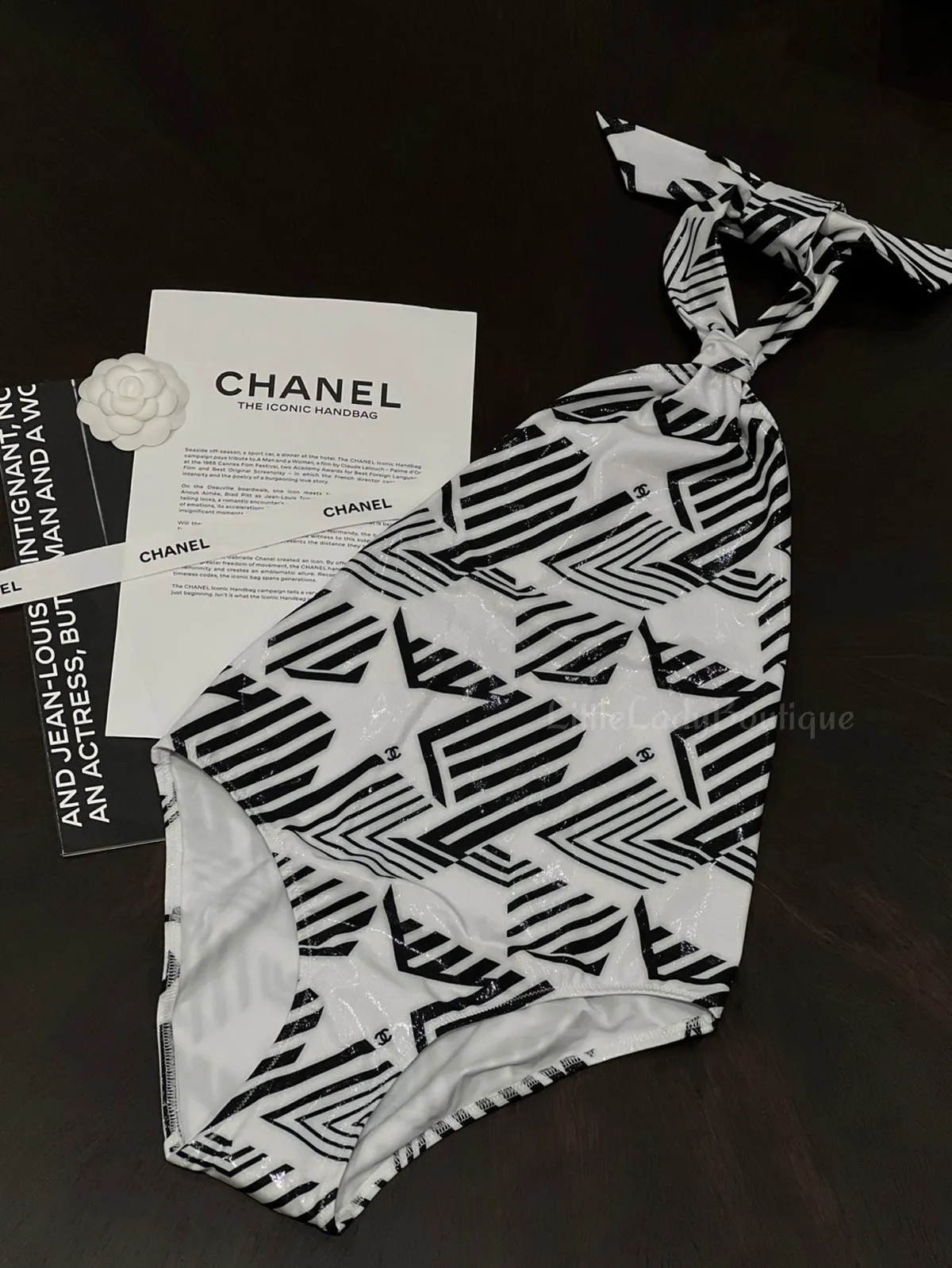 38號 CHANEL 女士 白底 黑線條 星星 連身泳衣