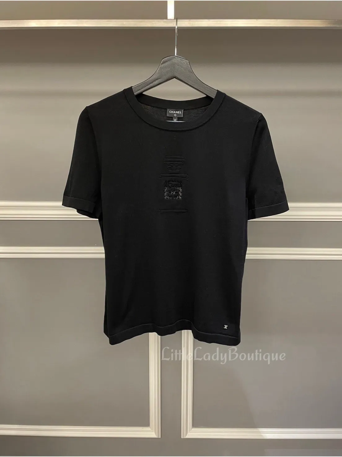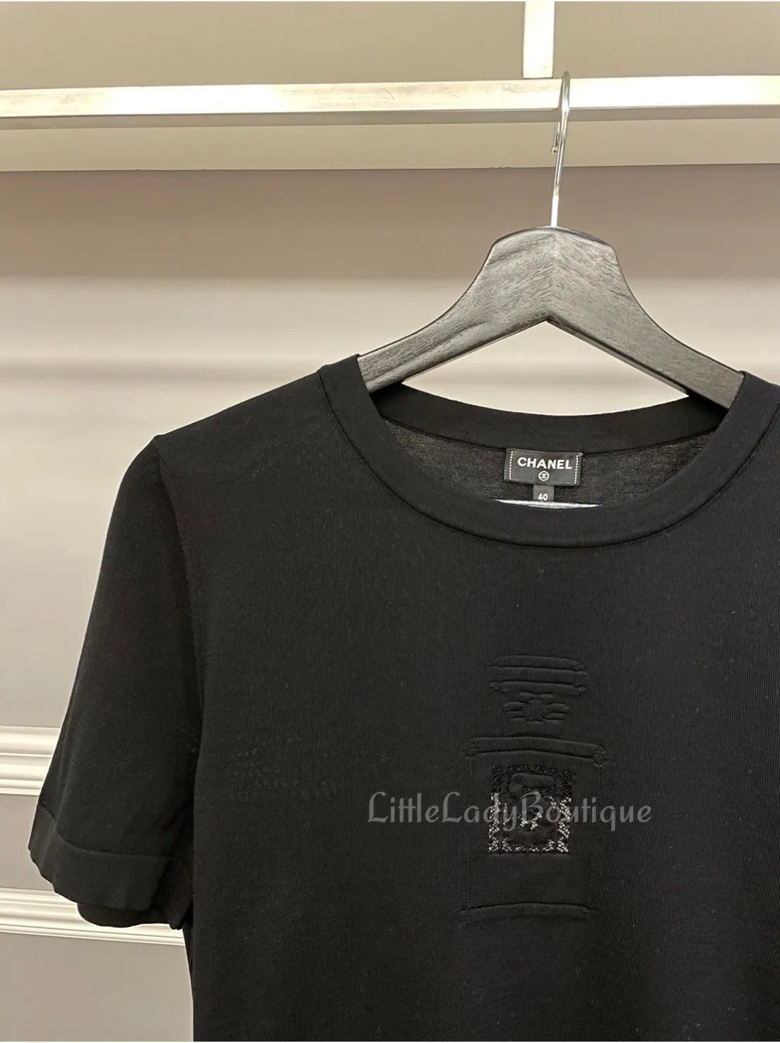 CHANEL 女士 黑底 中間5號香水罐圖案 短袖上衣 (左下鑽雙C)