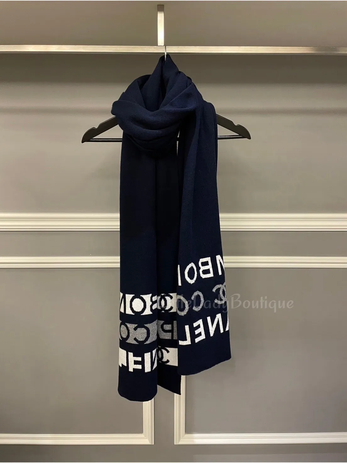 CHANEL 海軍藍 白灰白底字 長型圍巾 (64%CASHMERE+36%棉)