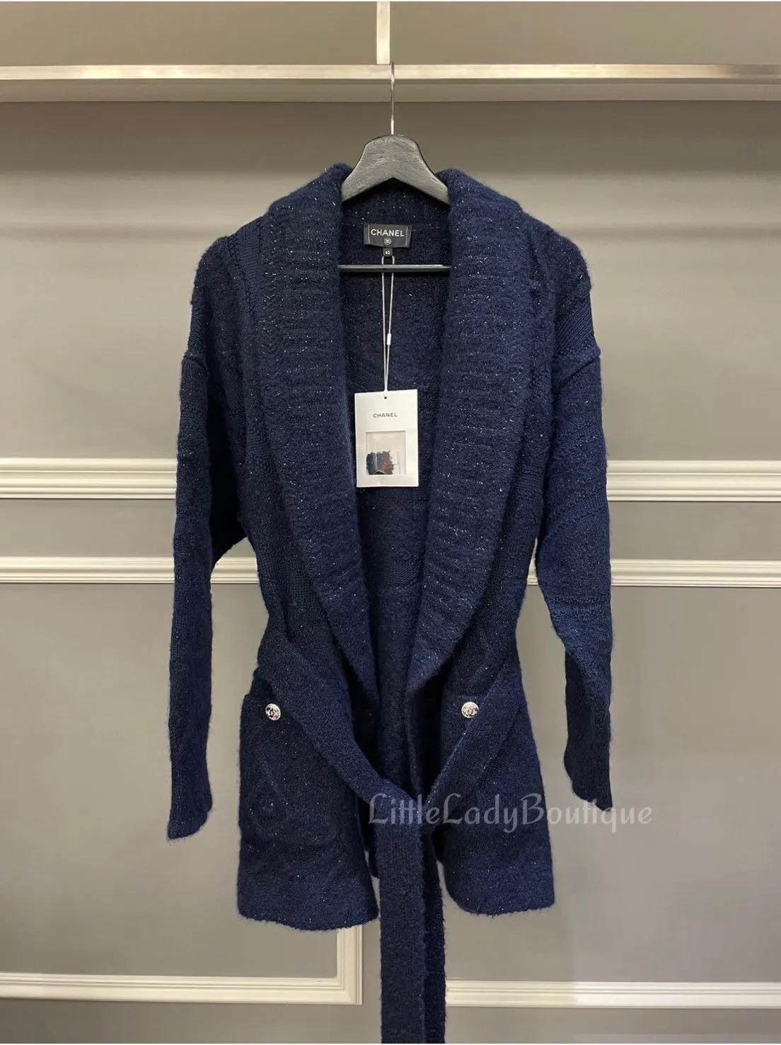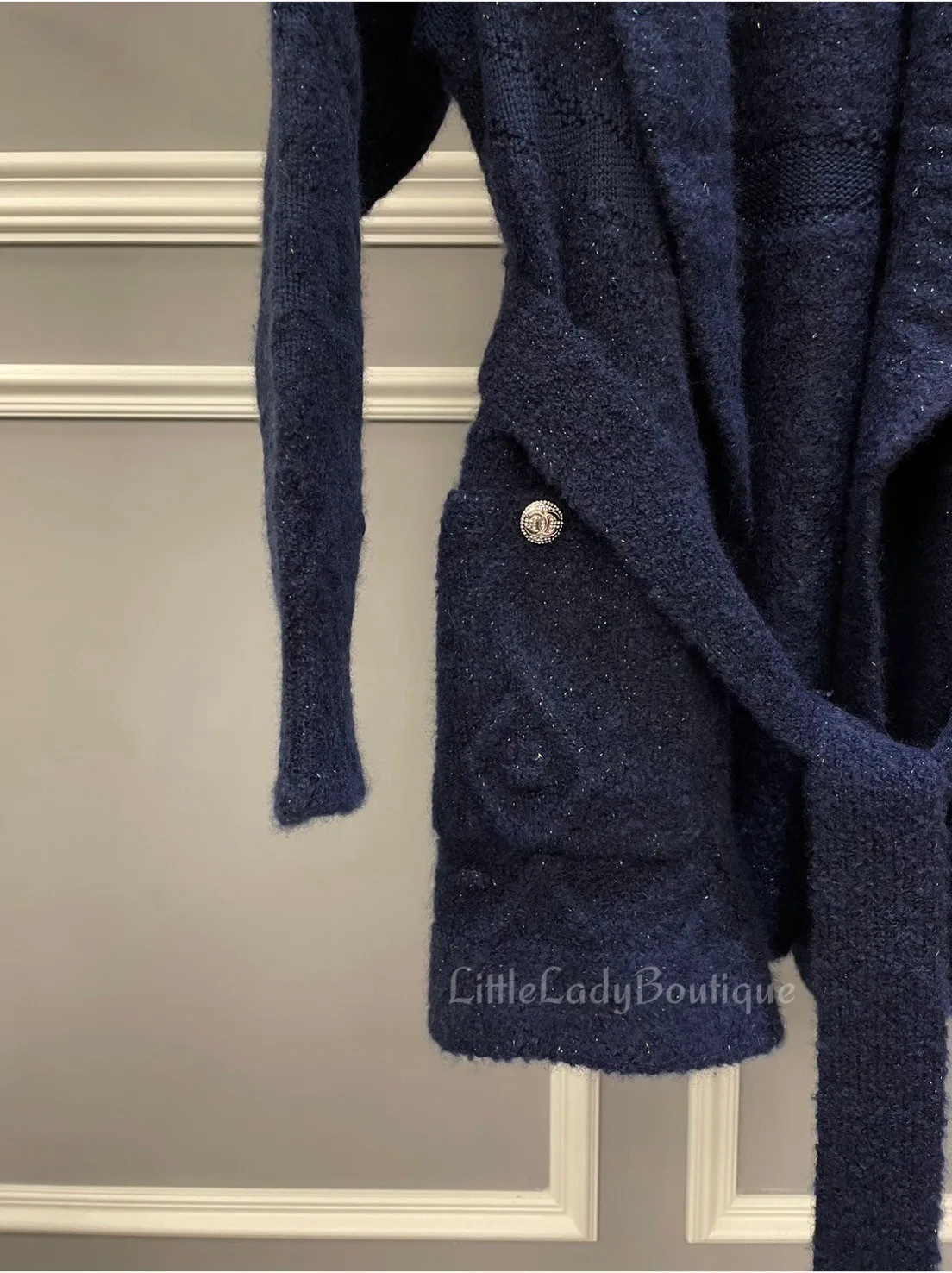 CHANEL 女士 海軍藍 亮蔥 雙口袋 綁腰帶 浴袍式開襟外套 (45%CASHMERE