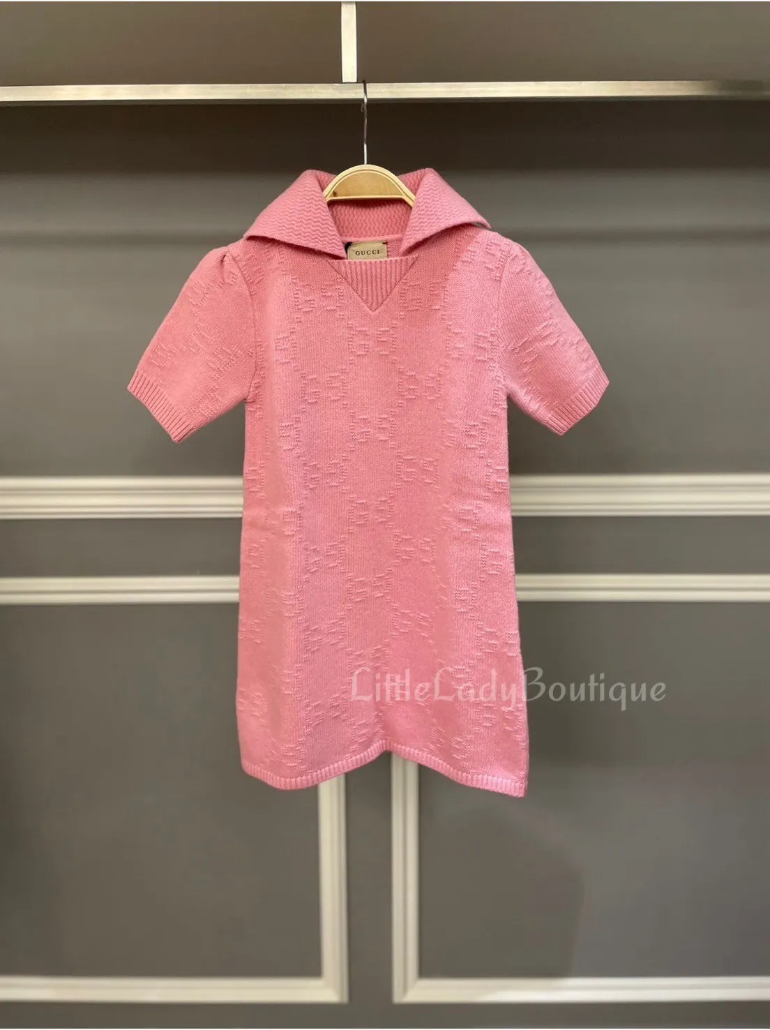 GUCCI 童裝 粉色 滿版雙G浮字 POLO領 針織 長袖連身裙
