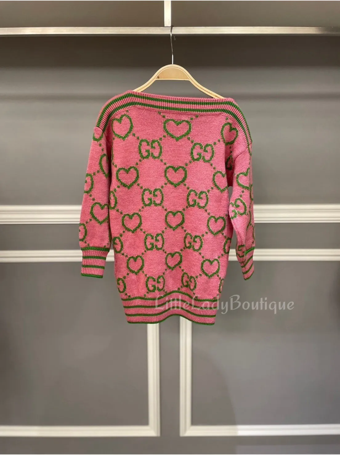 GUCCI 童裝 粉底 滿版綠G綠愛心圖 底綠橫線 長袖連身裙