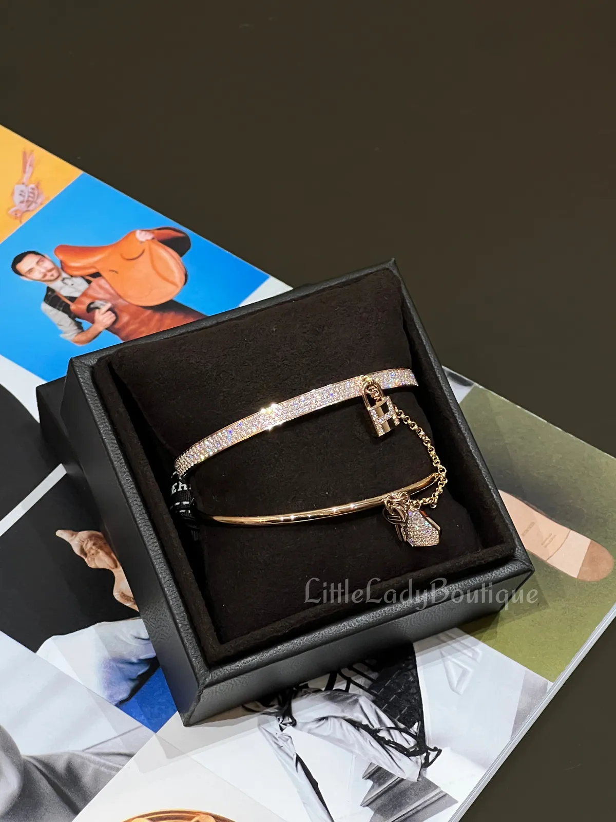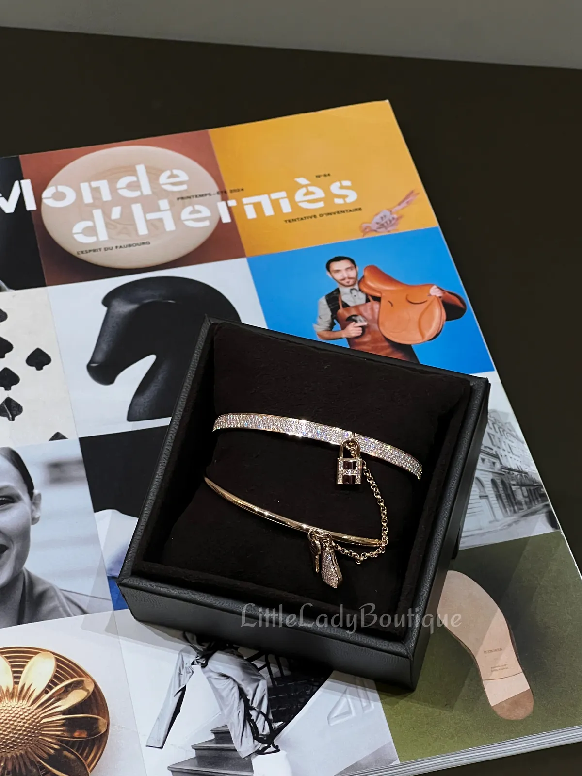 HERMES Kelly Cadenas 玫瑰金 鑽 鎖釦皮革鑰匙 雙圈手環 (431顆鑽