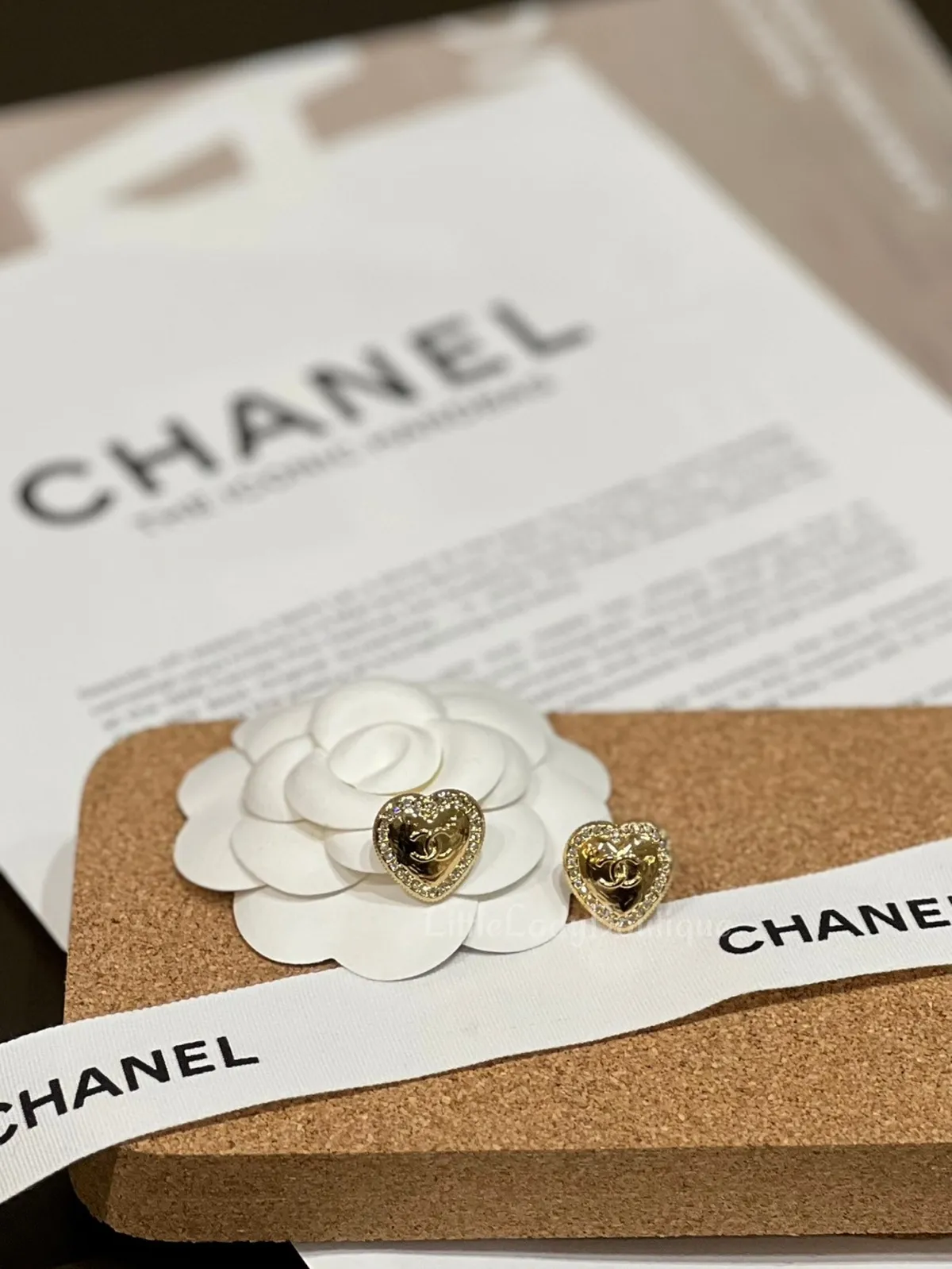 CHANEL 金色愛心 外邊框滿鑽 中間雙C 貼耳式耳針耳環