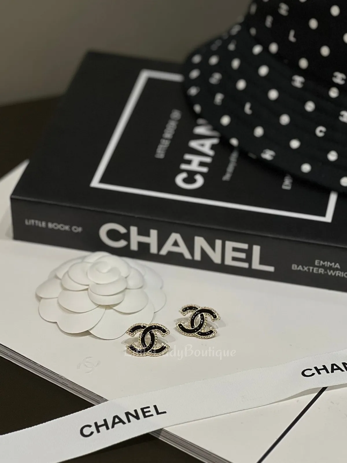 CHANEL 金色鍊子造型邊框大雙C 內黑字 貼耳式耳針耳環