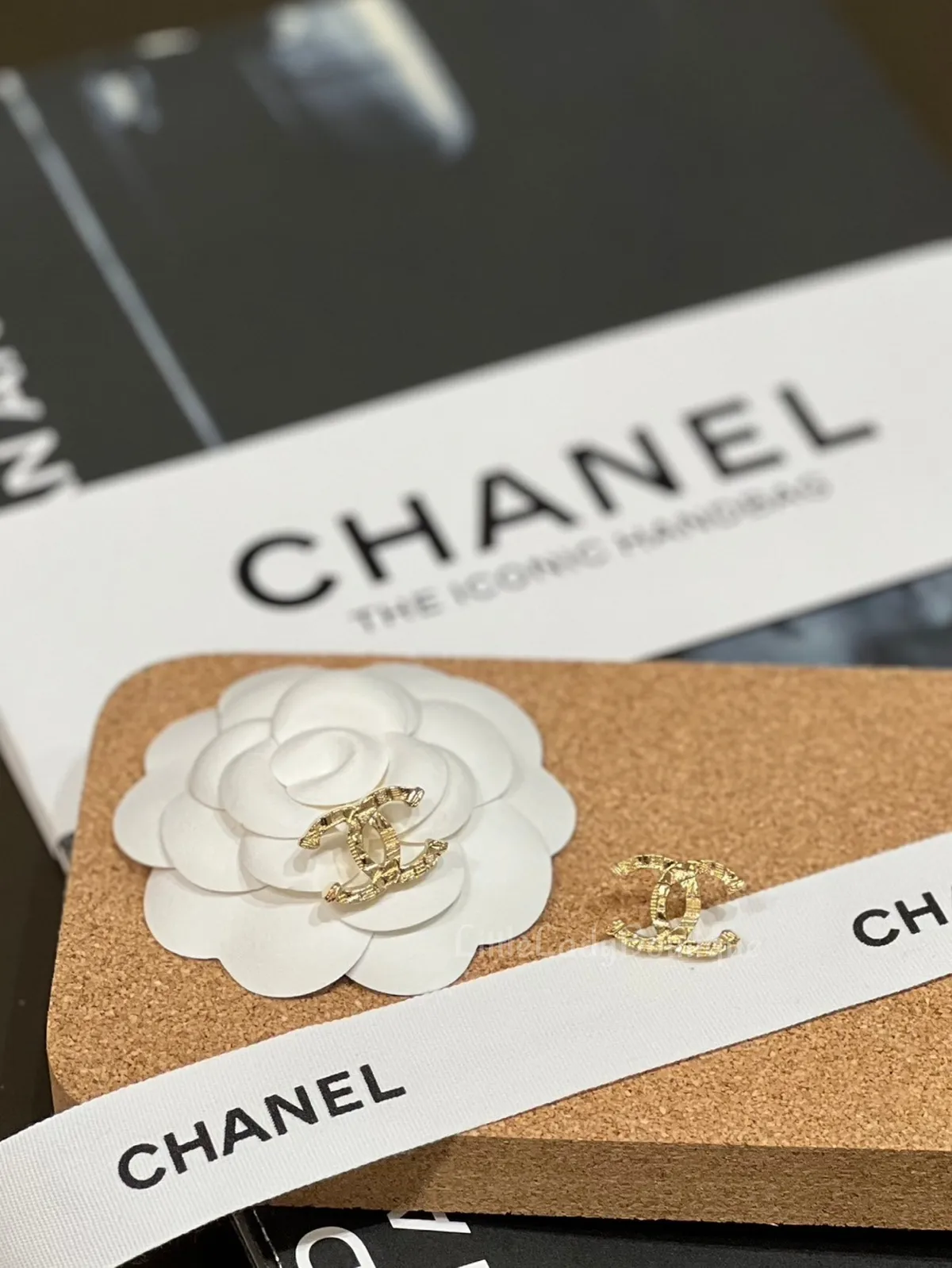 CHANEL 金色雙C格紋 4邊角圓釦造型 貼耳式耳針耳環