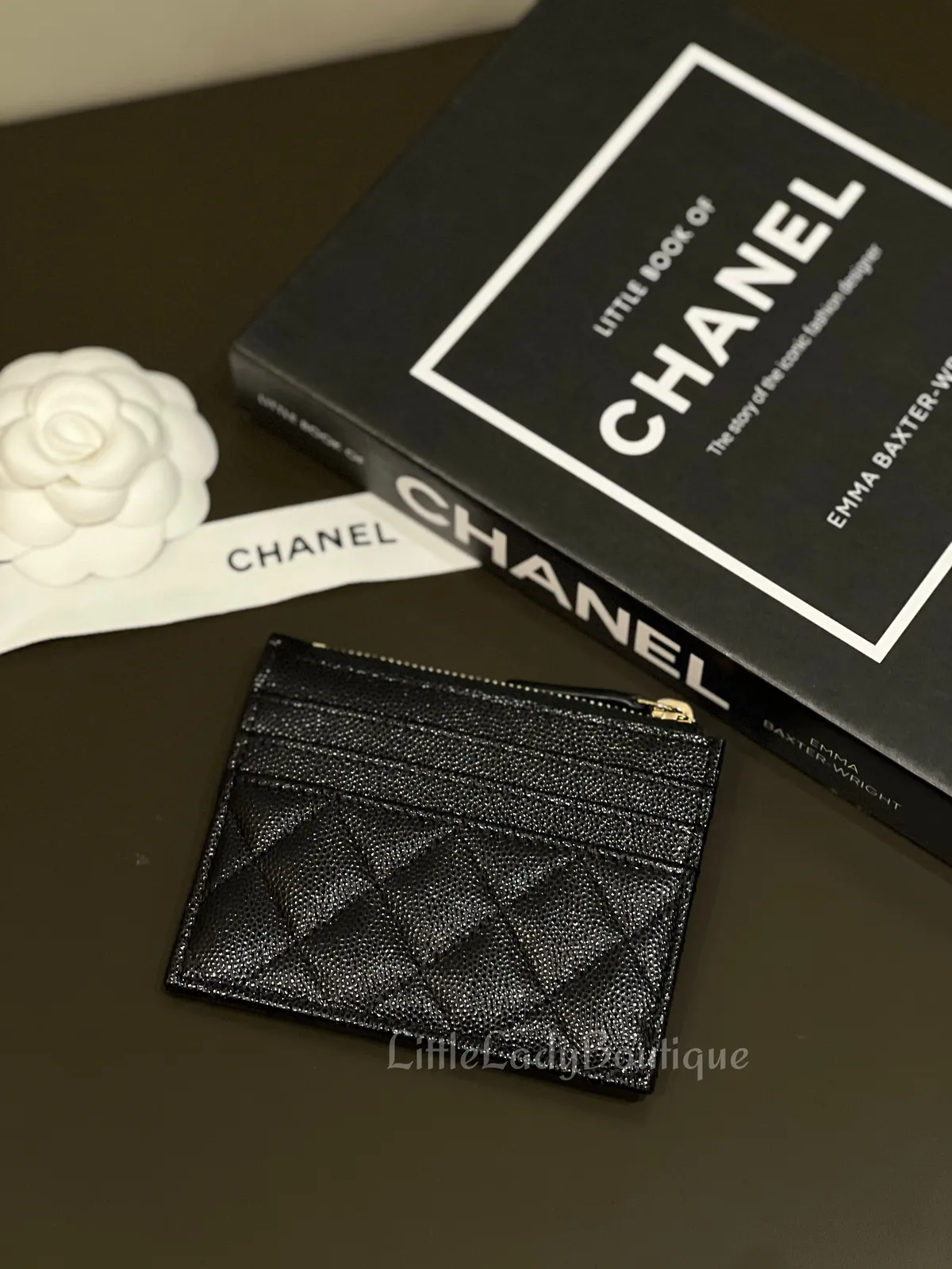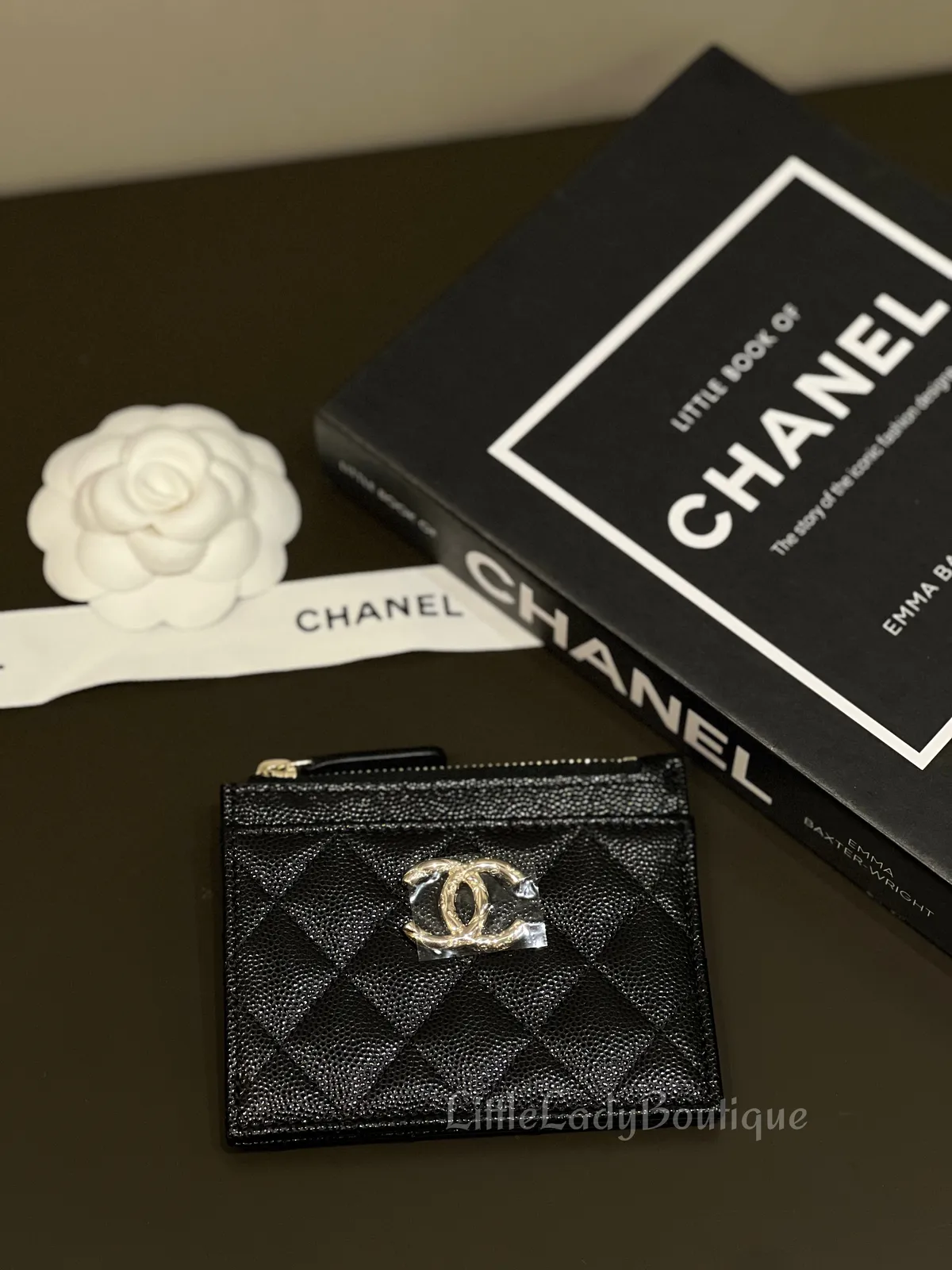 CHANEL 香檳金大雙C釦(雙C刻紋) 黑色 荔枝紋牛皮 一字拉鍊卡片零錢包(背後3卡層