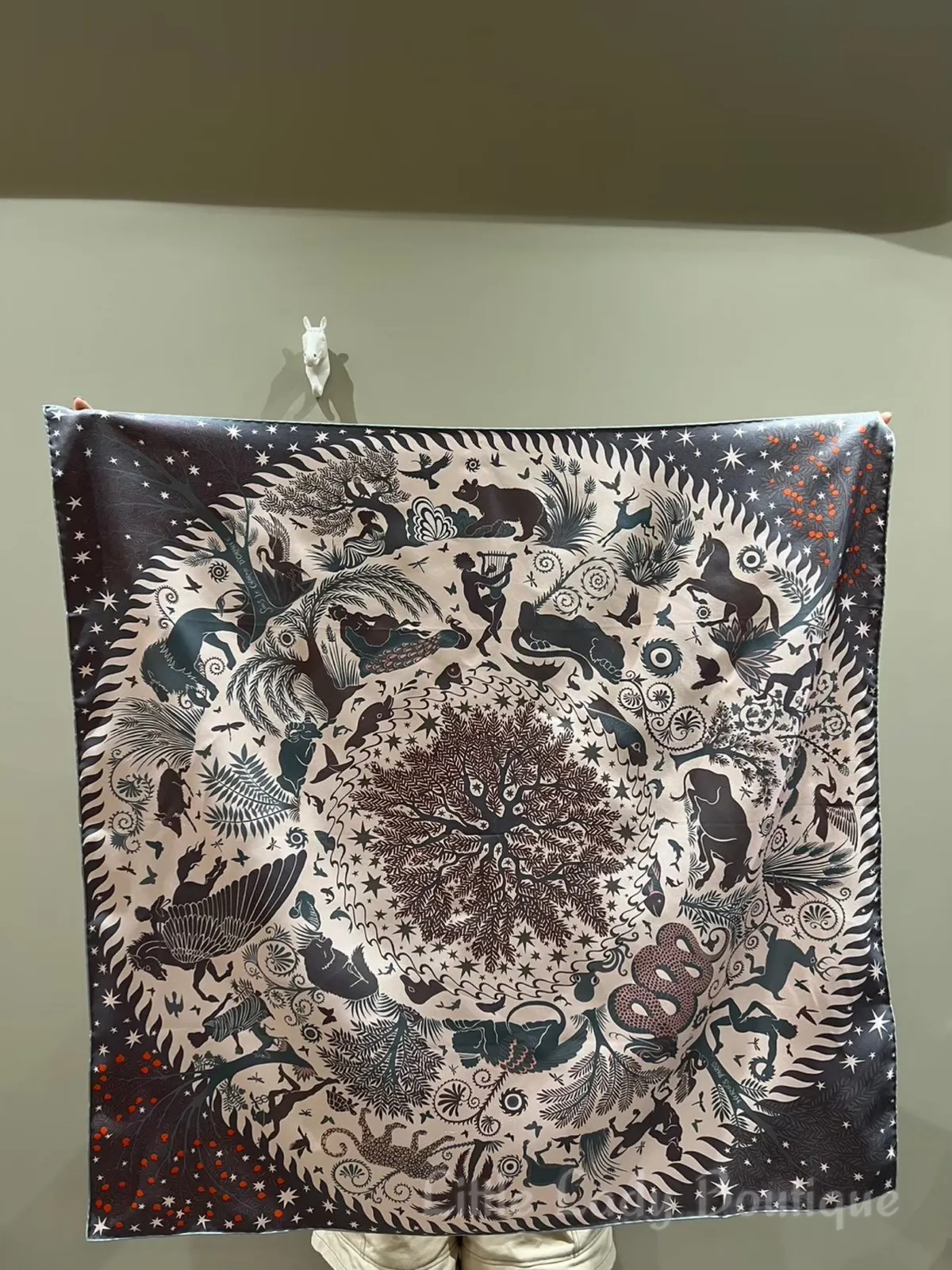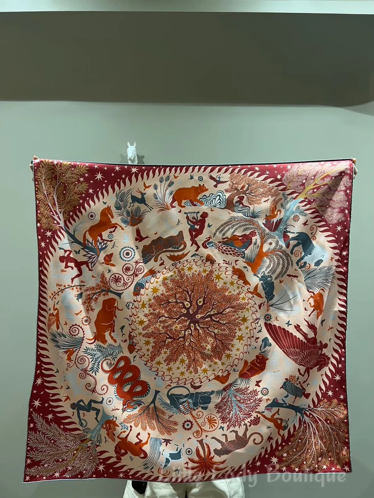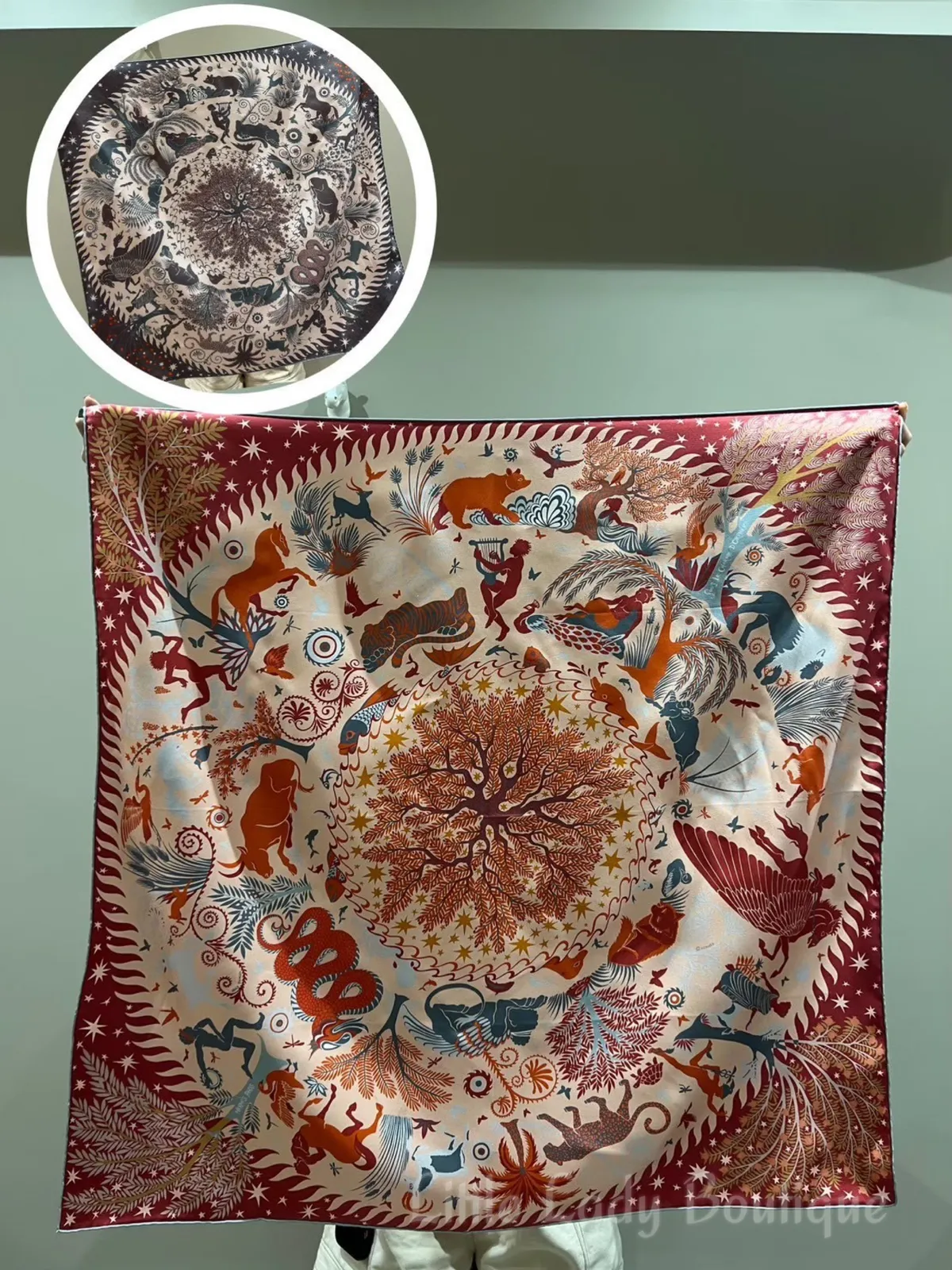 HERMES 90*90絲巾 雙面雙色 希臘神話 動物森林 (紅色/ 玫瑰粉紅/ 灰藍色)