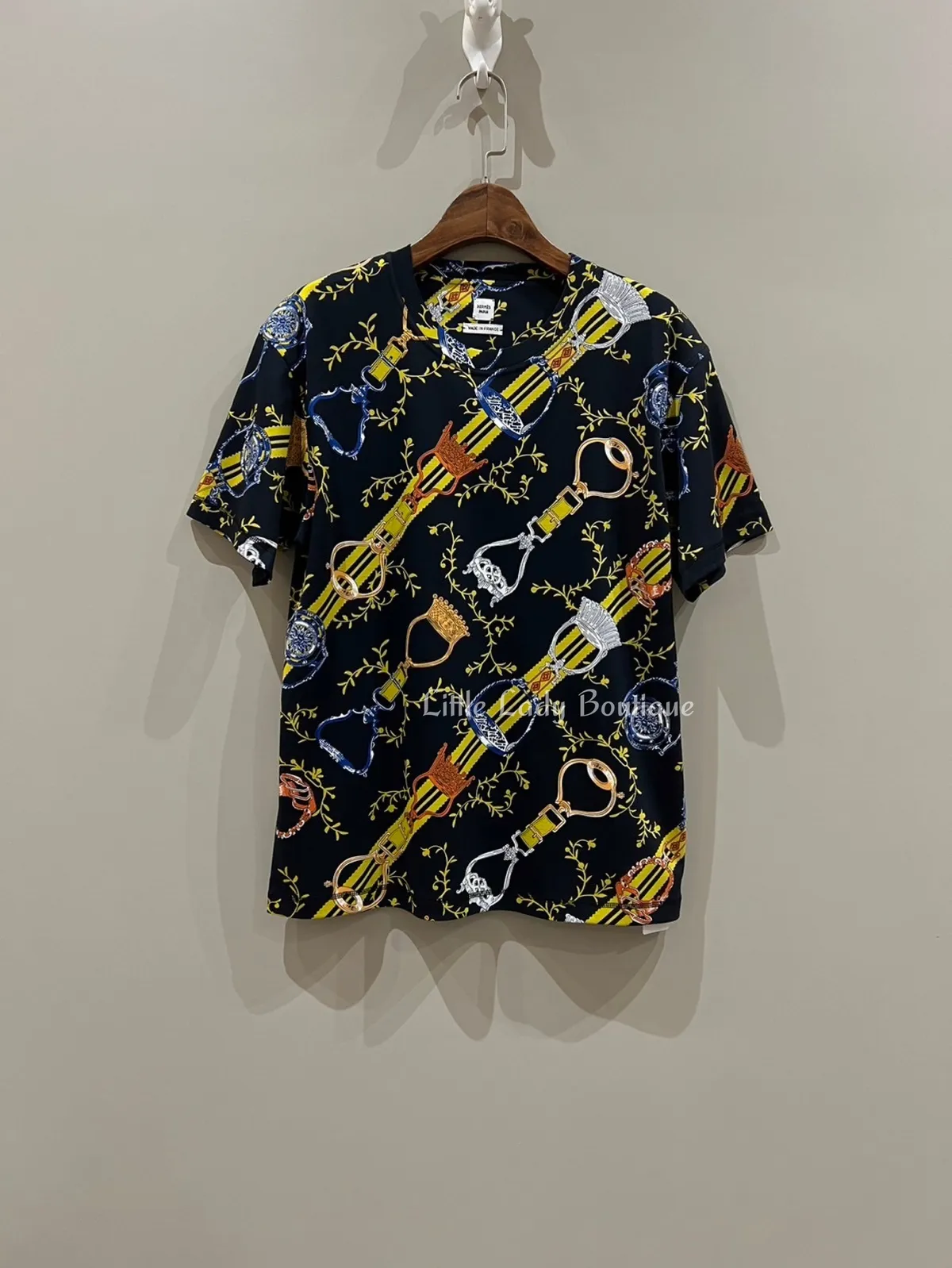 HERMES 女士 深淵藍 華麗馬鐙聯鎖圖案 短袖上衣 (100%棉)