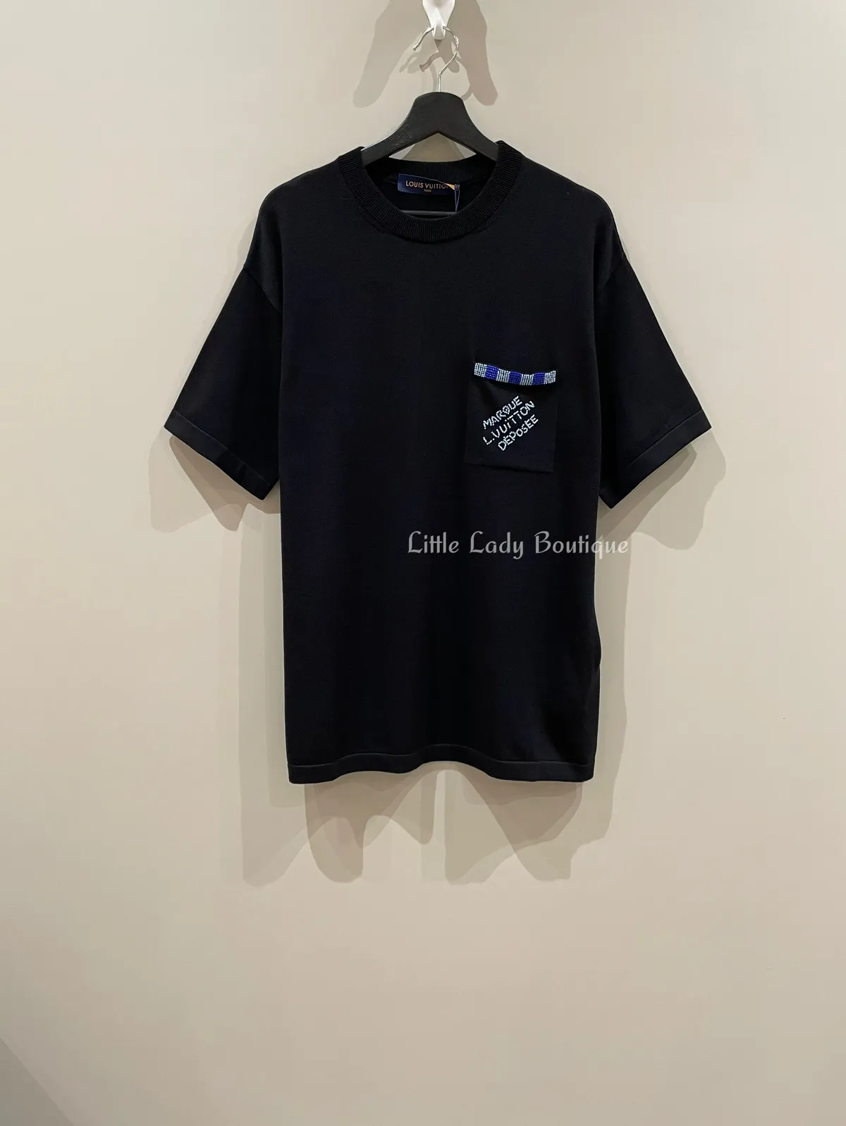 LV 男士 黑底 左胸藍色珠飾刺繡造型口袋 短袖上衣(100%棉)