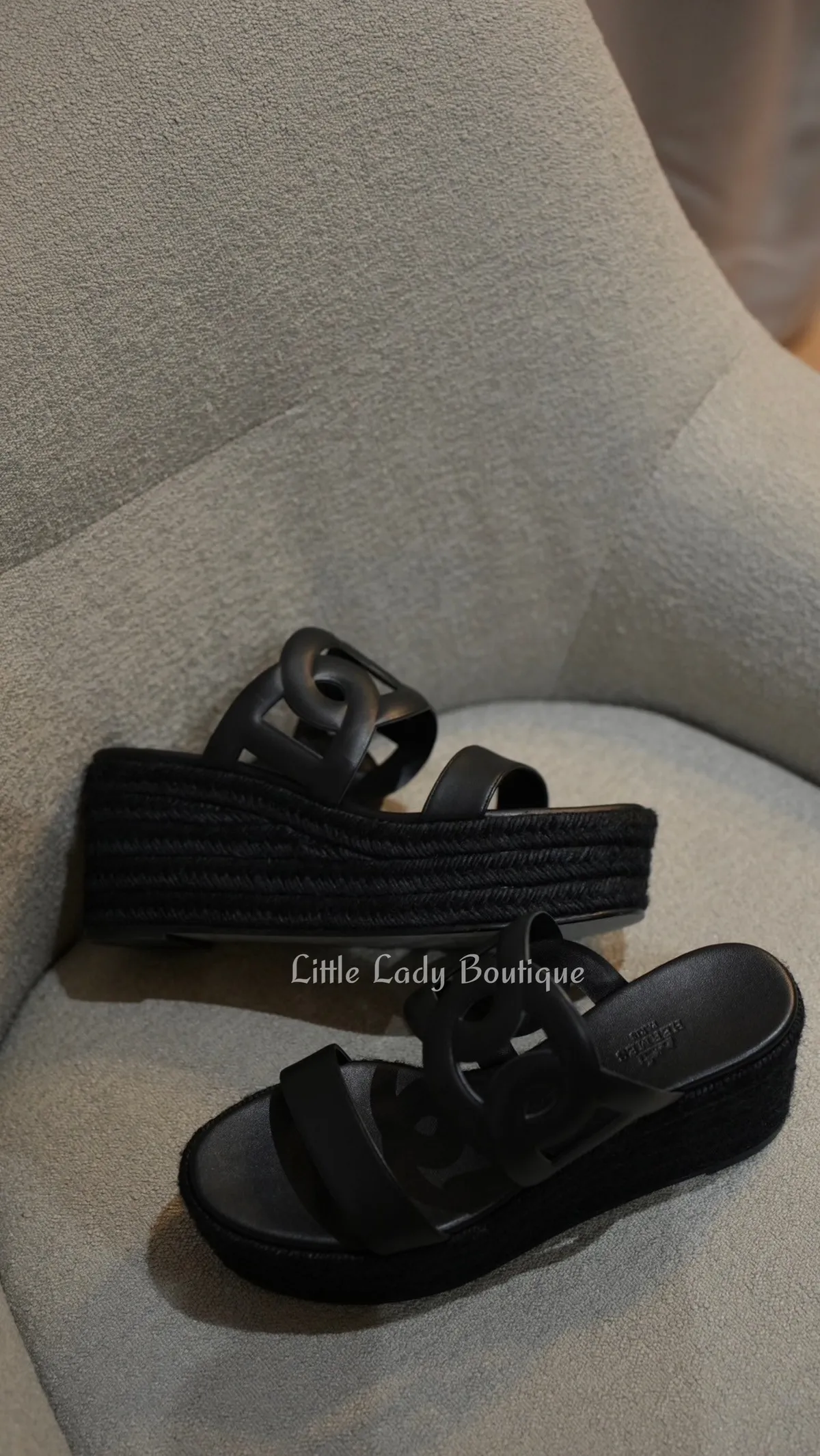 HERMES 女士 ITHEA 30 黑色 豬鼻鏤空雙帶造型 麻邊厚底 涼拖鞋