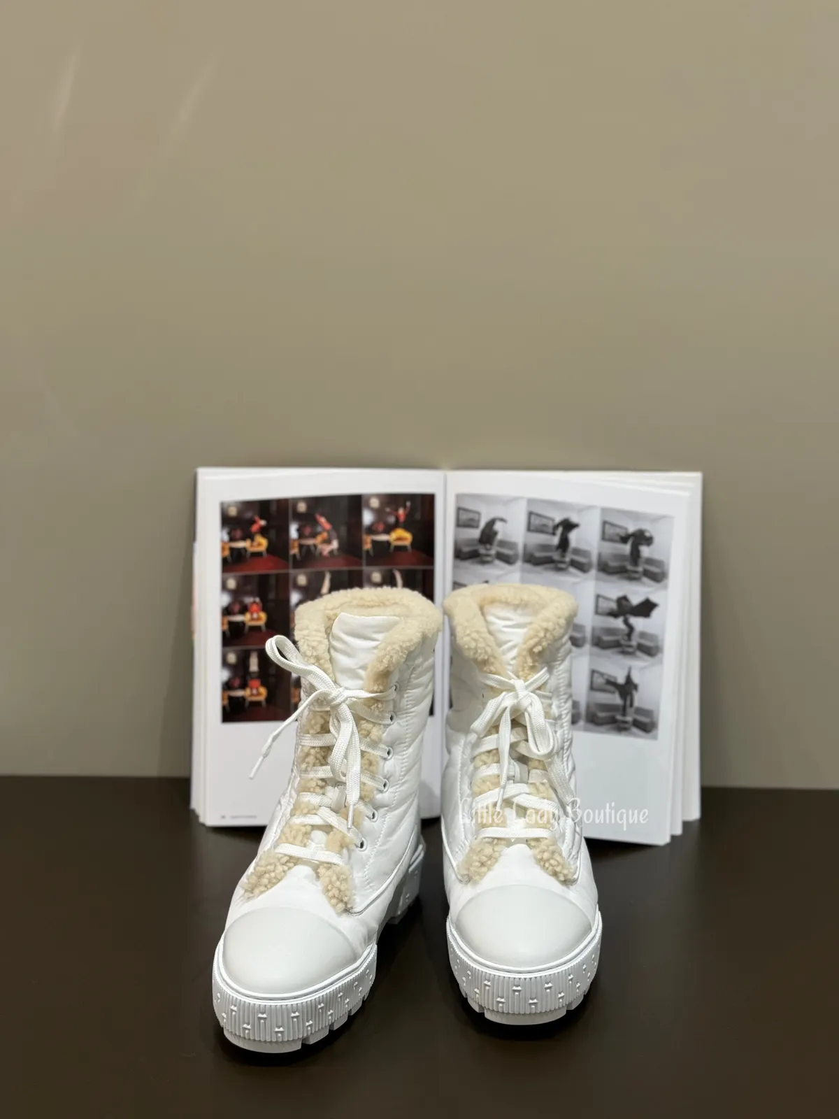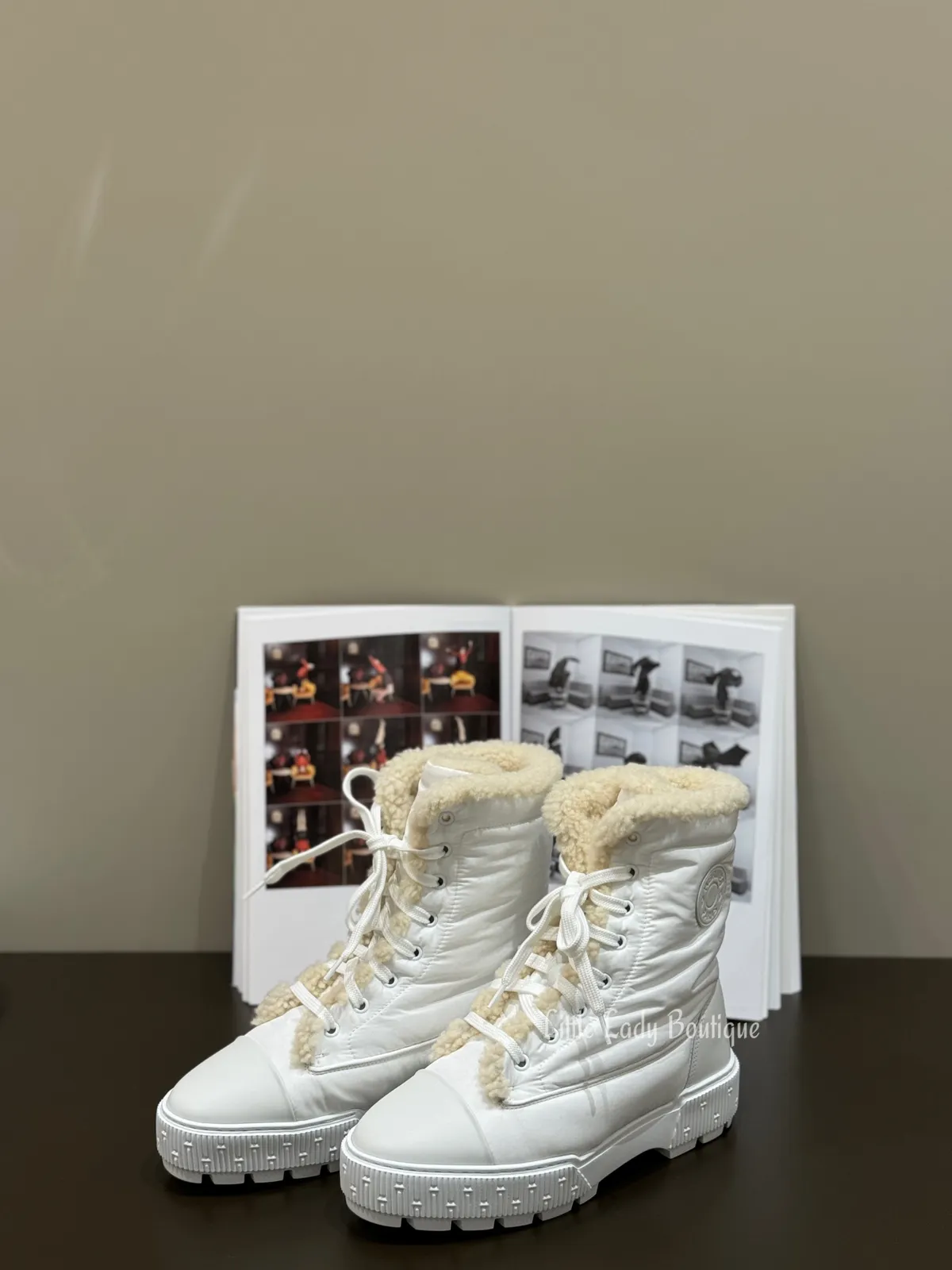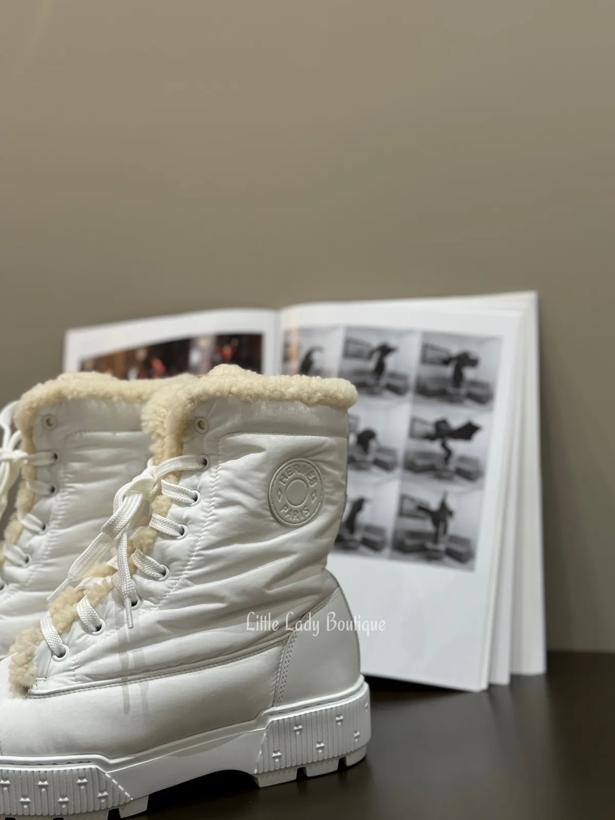 HERMES 女士 FRESH 白色 牛皮&降落傘異材質拼接 內羊毛皮 短靴 (鞋