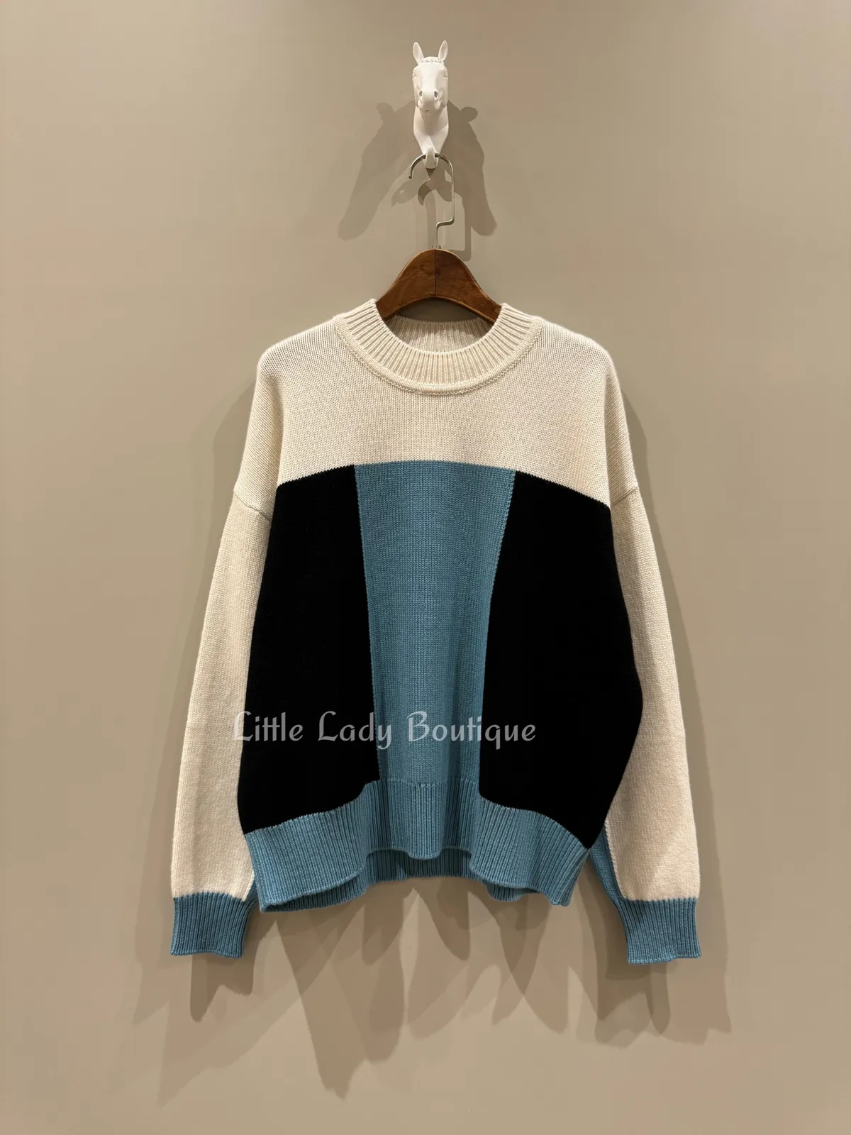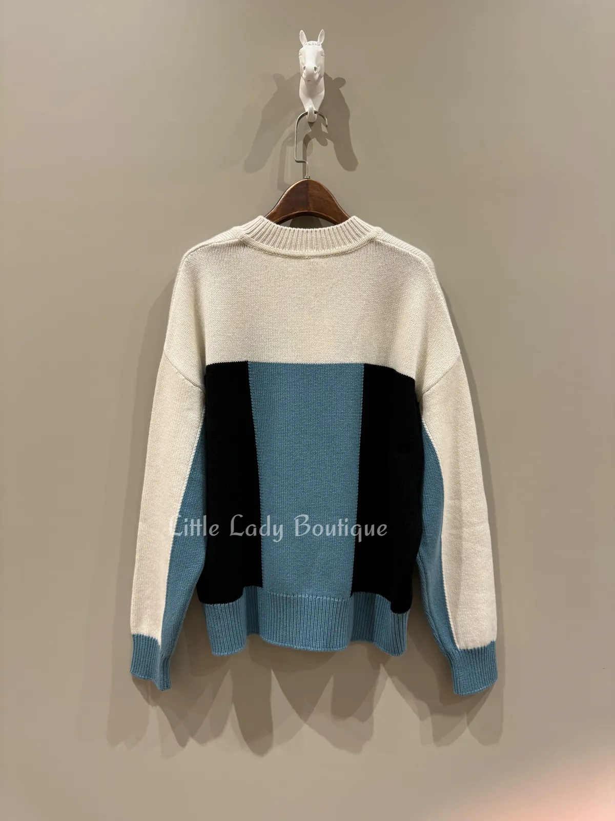 HERMES 女士 Lettres Equestres 米/黑/藍色塊 長袖針織上衣 (1
