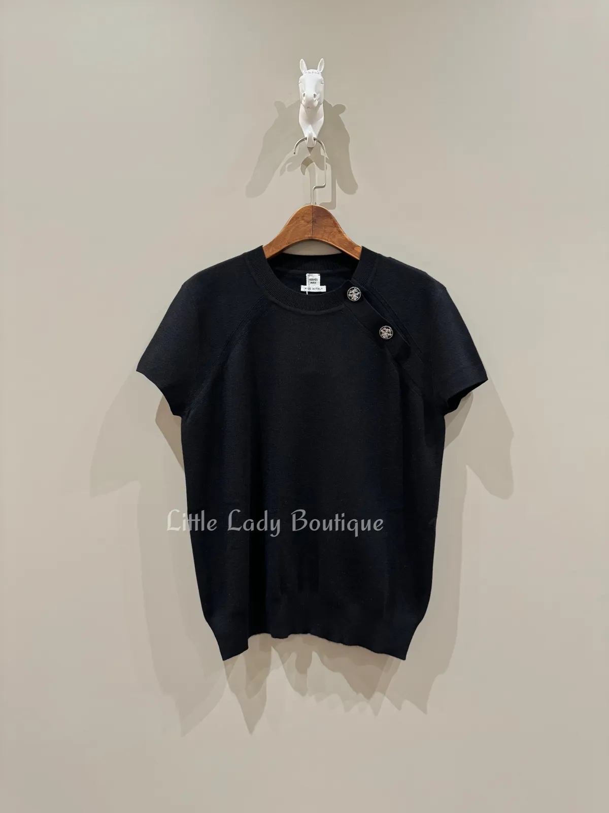 HERMES 女士 黑色 左肩2黑法瑯釦 短袖針織上衣(50%羊絨、50%絲)