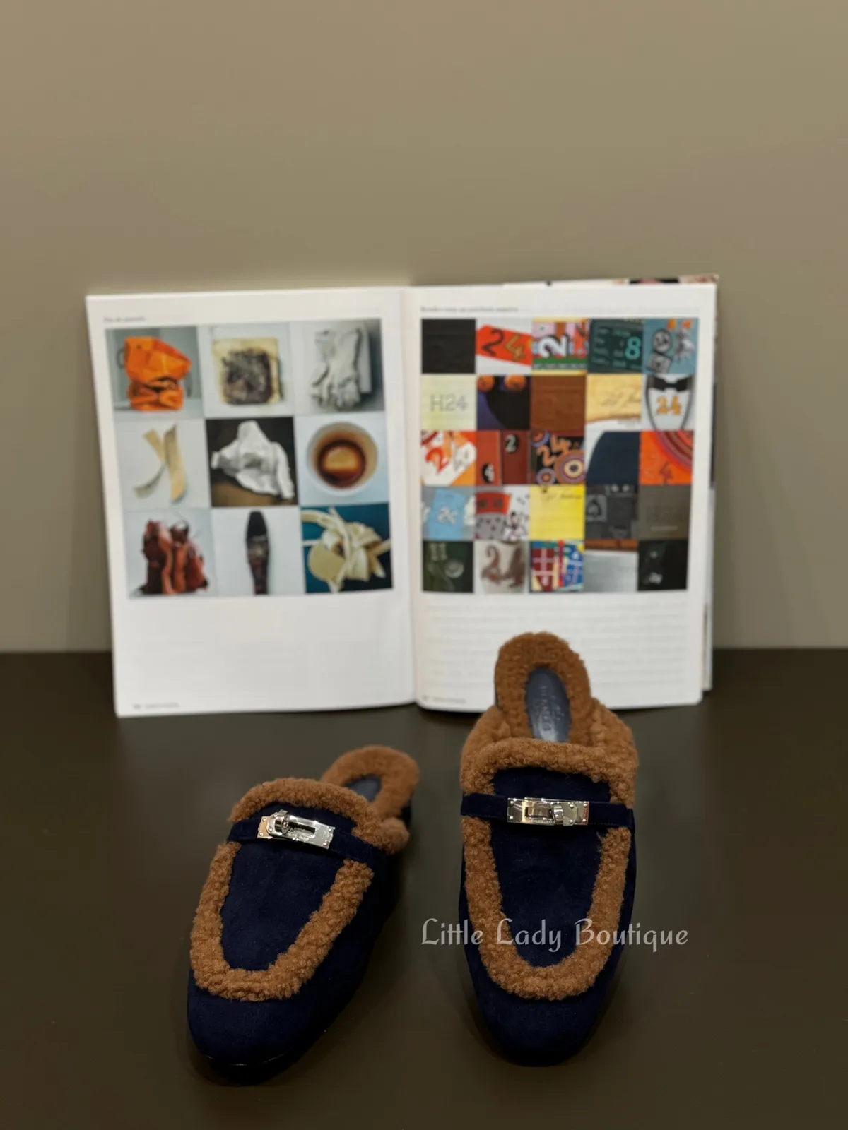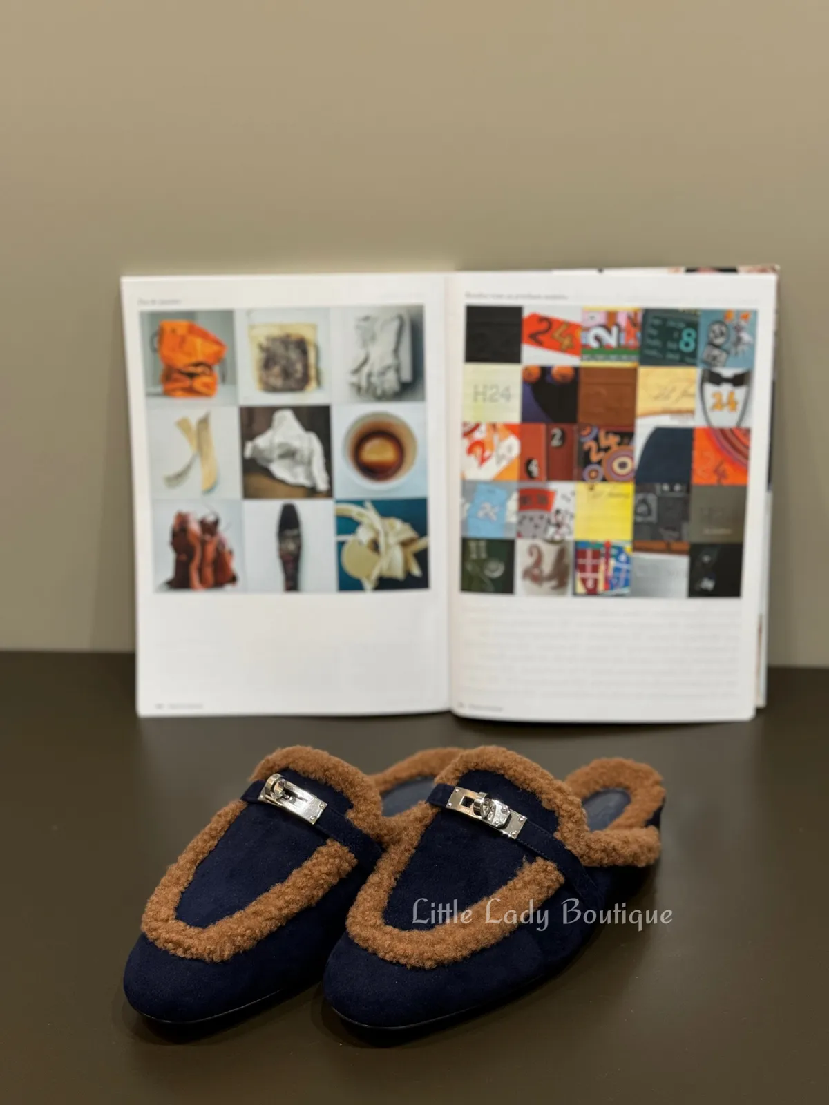 HERMES 女士 OZ 銀色凱莉釦 海軍藍色 山羊麂皮 駝咖羊毛毛 穆勒鞋