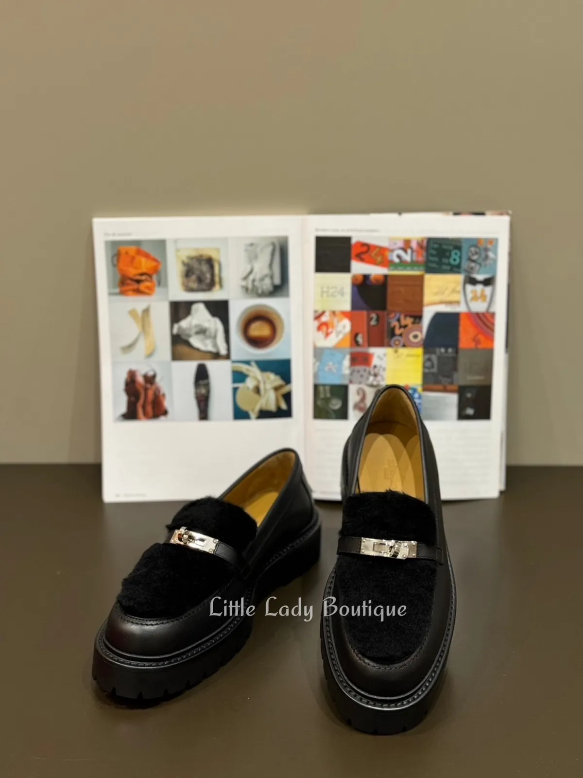 HERMES 女士 ICONE 銀釦 黑色小牛皮 黑色羊毛毛 樂福鞋