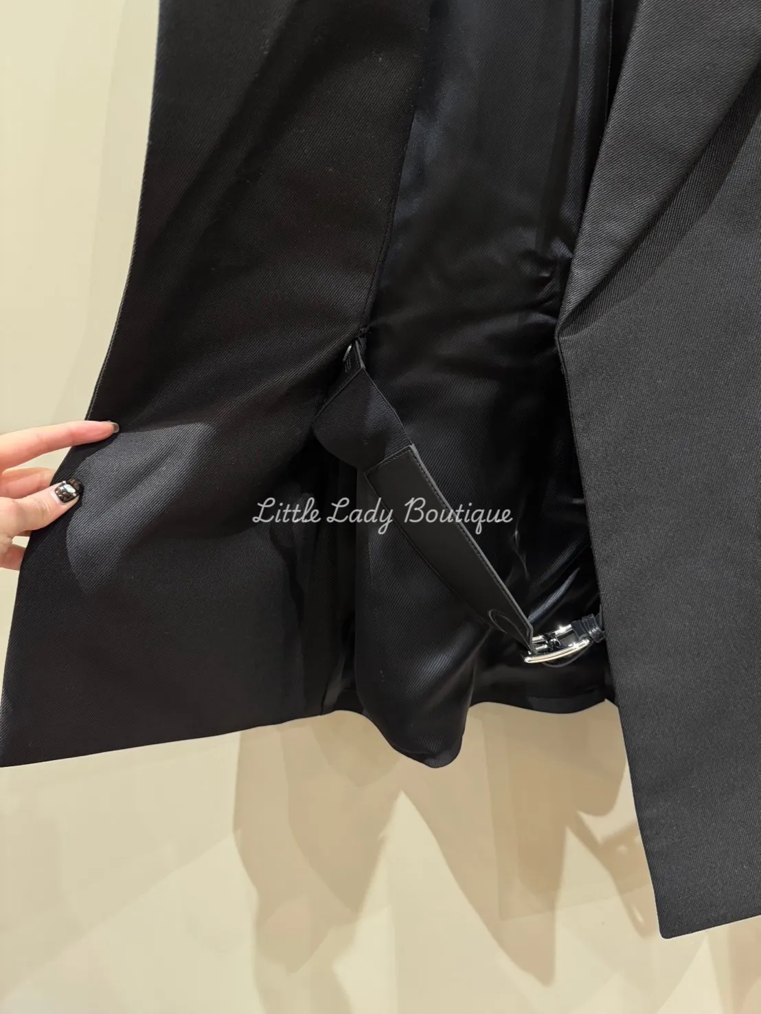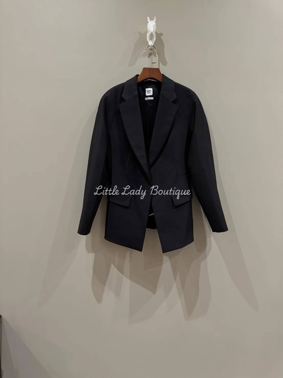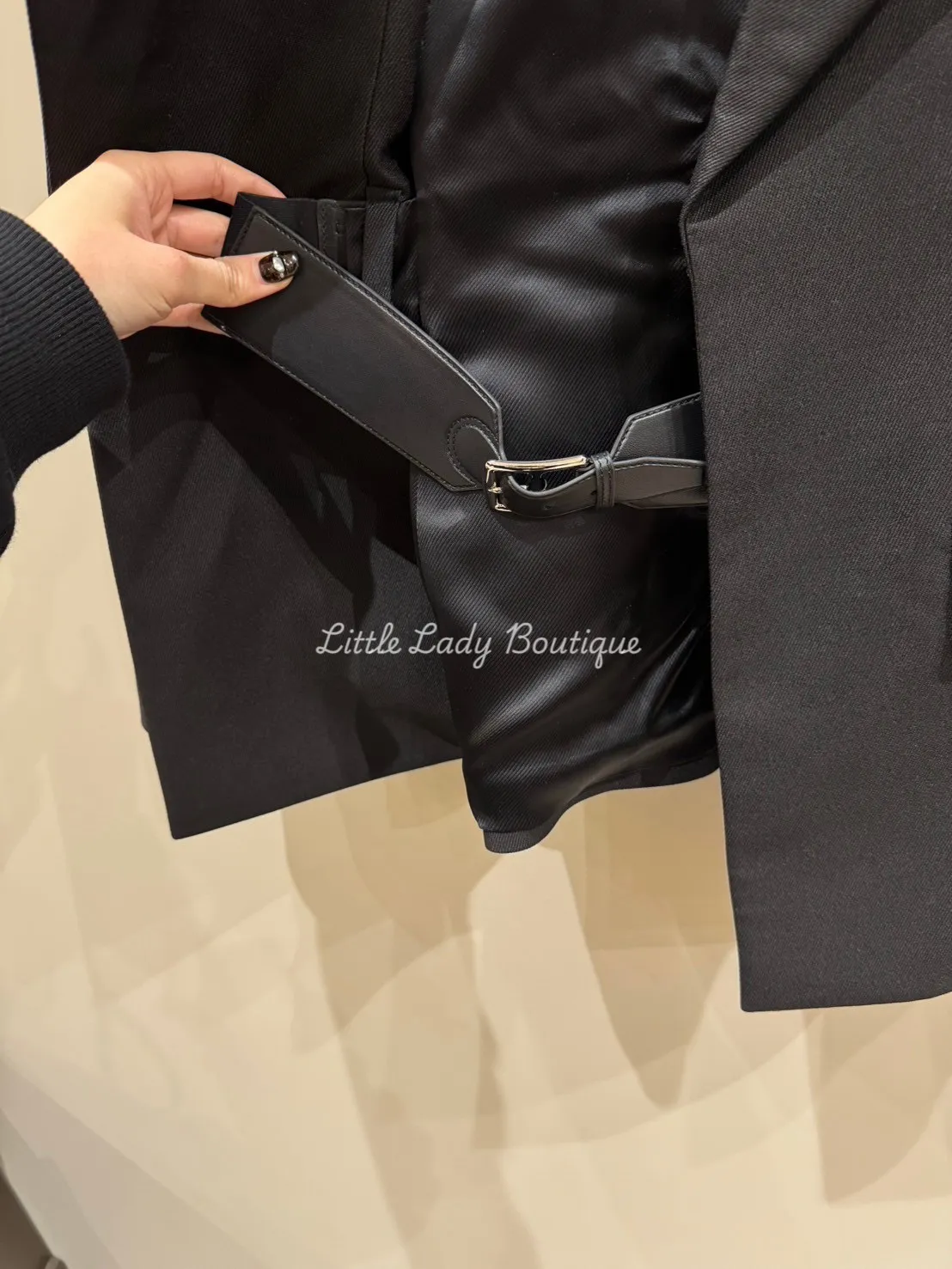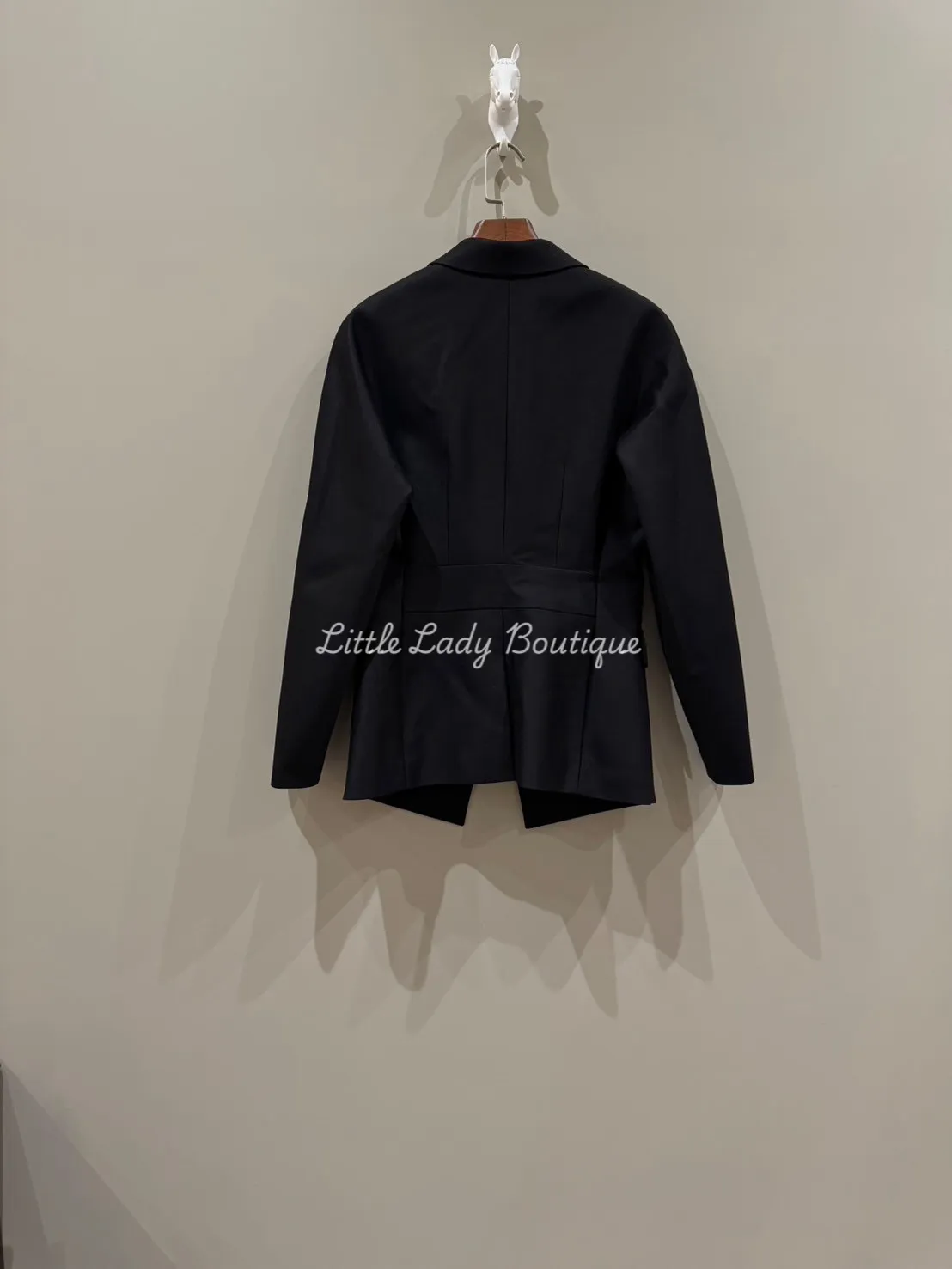 HERMES 女士 黑色 有領 雙口袋 縮腰內腰帶造型 羊毛 西裝外套(61%黏膠纖維5%