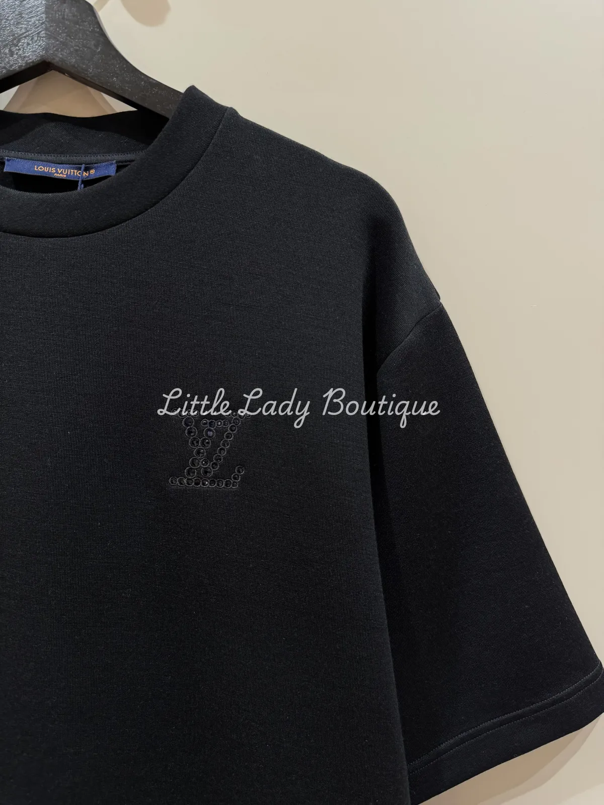 LV 男士 黑底 左胸藍黑水鑽LV字 短袖上衣(39%羊毛32%聚酰胺纖維29%棉)