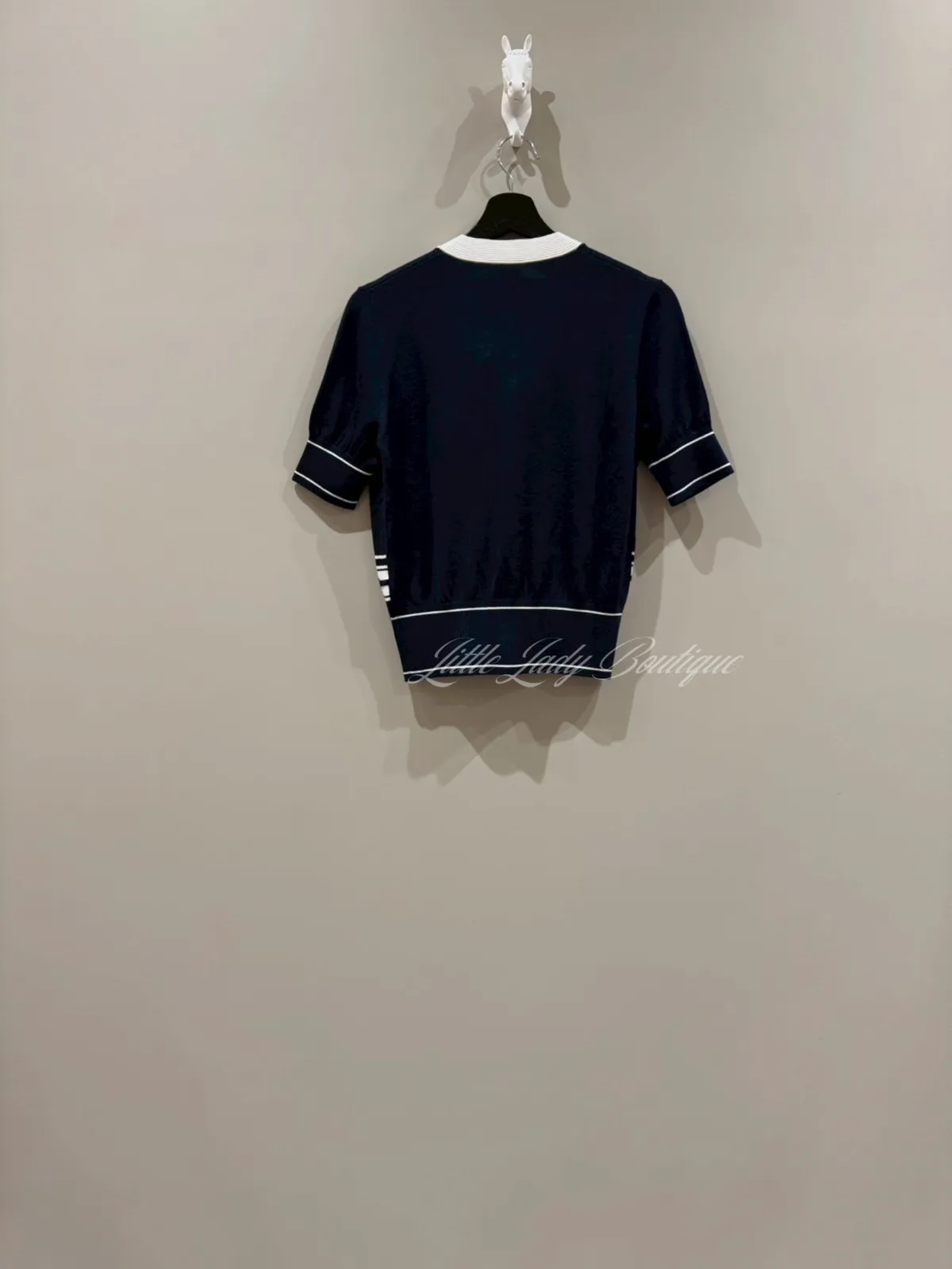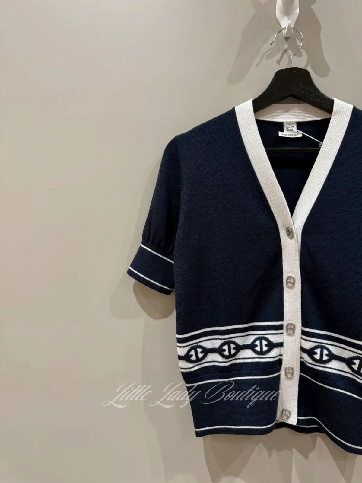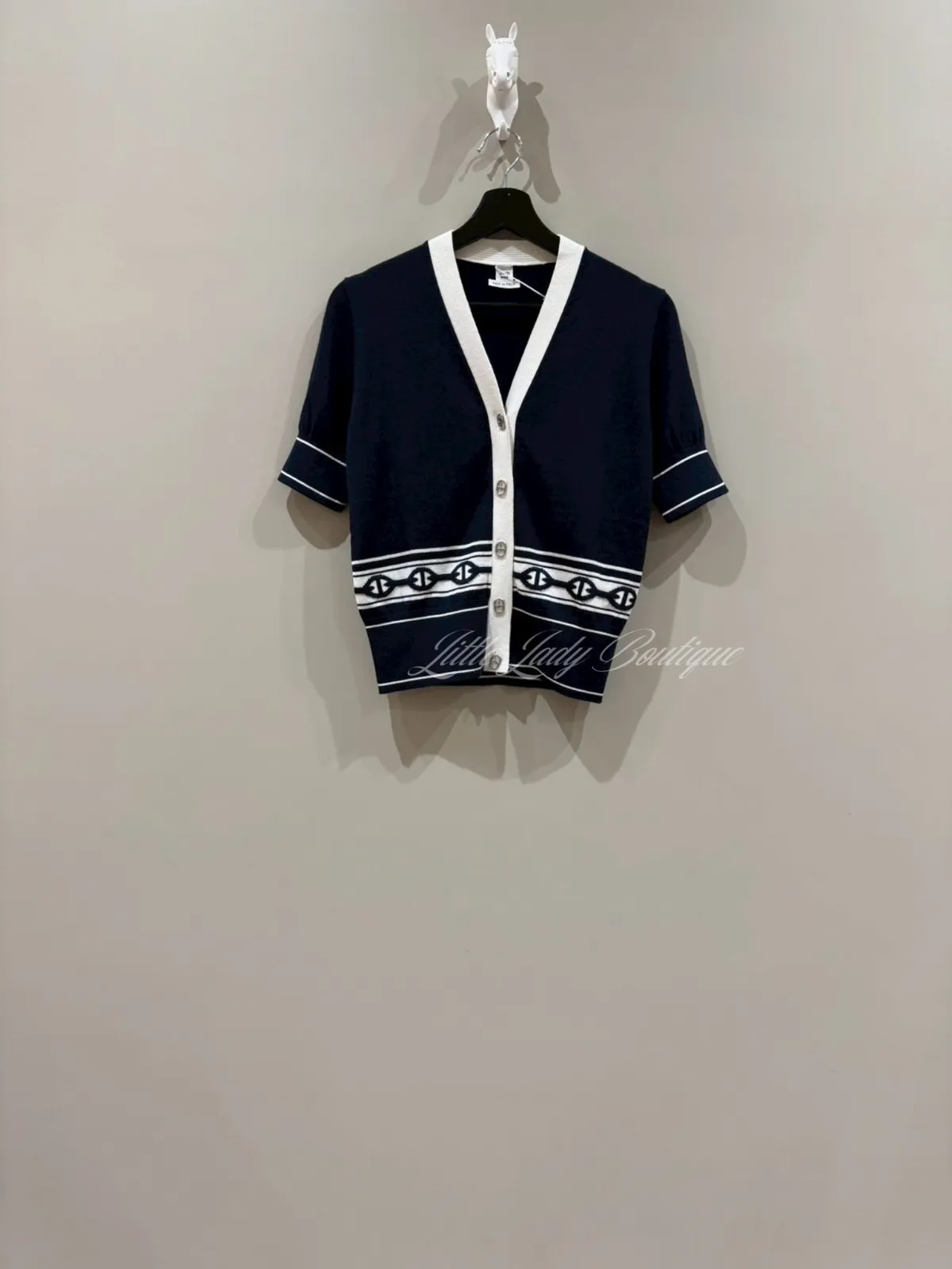 HERMES 女士 黑藍底 白邊 腰間白豬鼻圖案 豬鼻釦 短袖針織排釦上衣(50%CASH