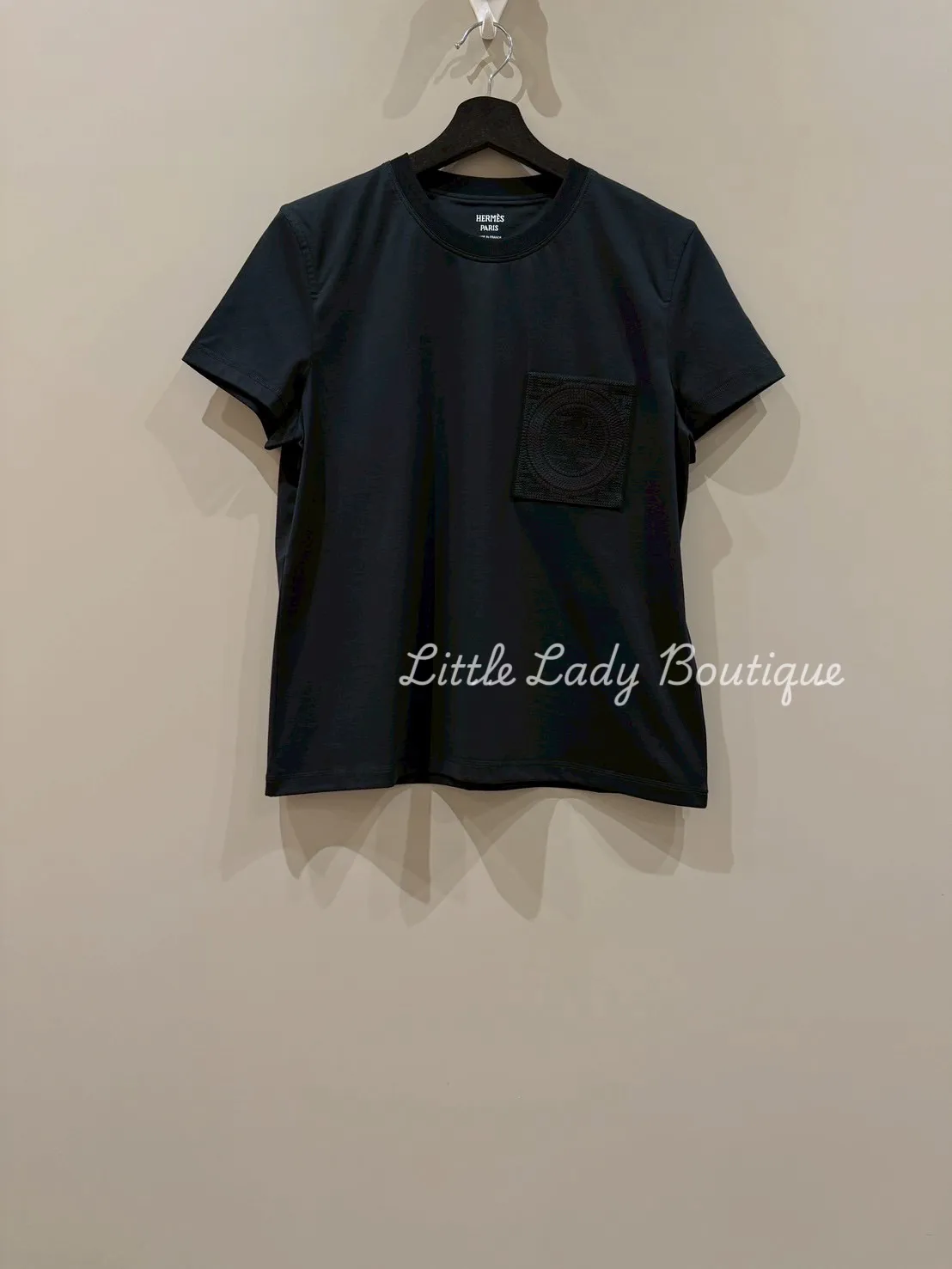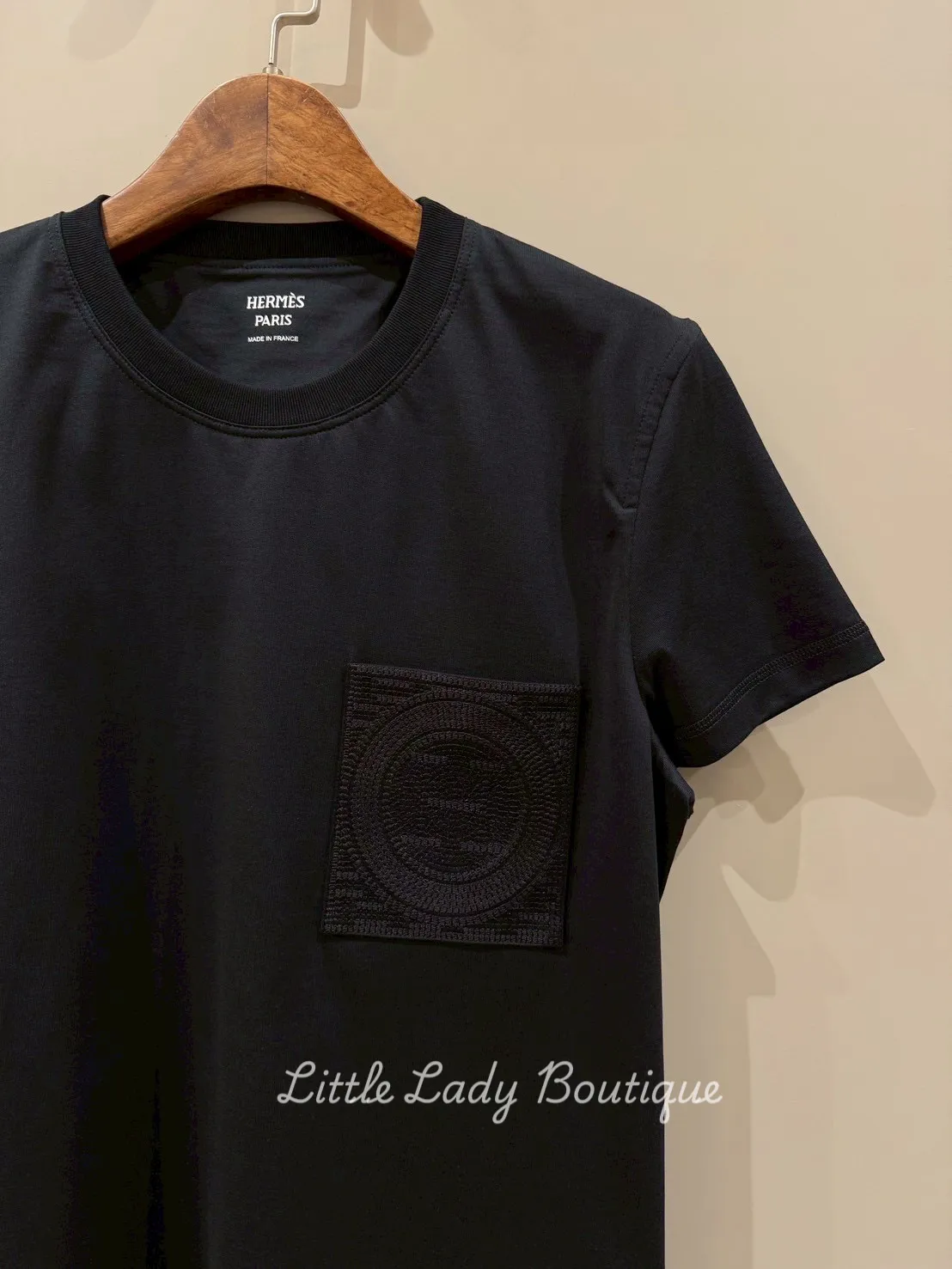 HERMES 女士 黑底 左胸口袋刺繡馬賽克H圖案 短袖上衣 (100%棉)