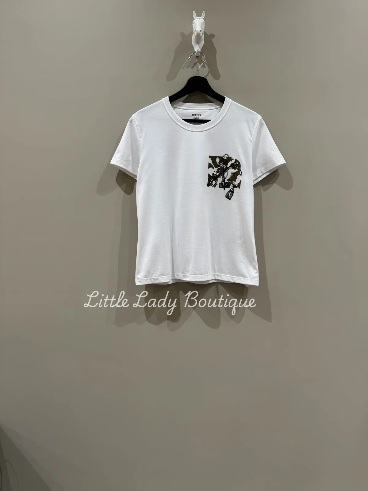HERMES 女士 白底 左胸馬具圖案 短袖上衣(100%棉)