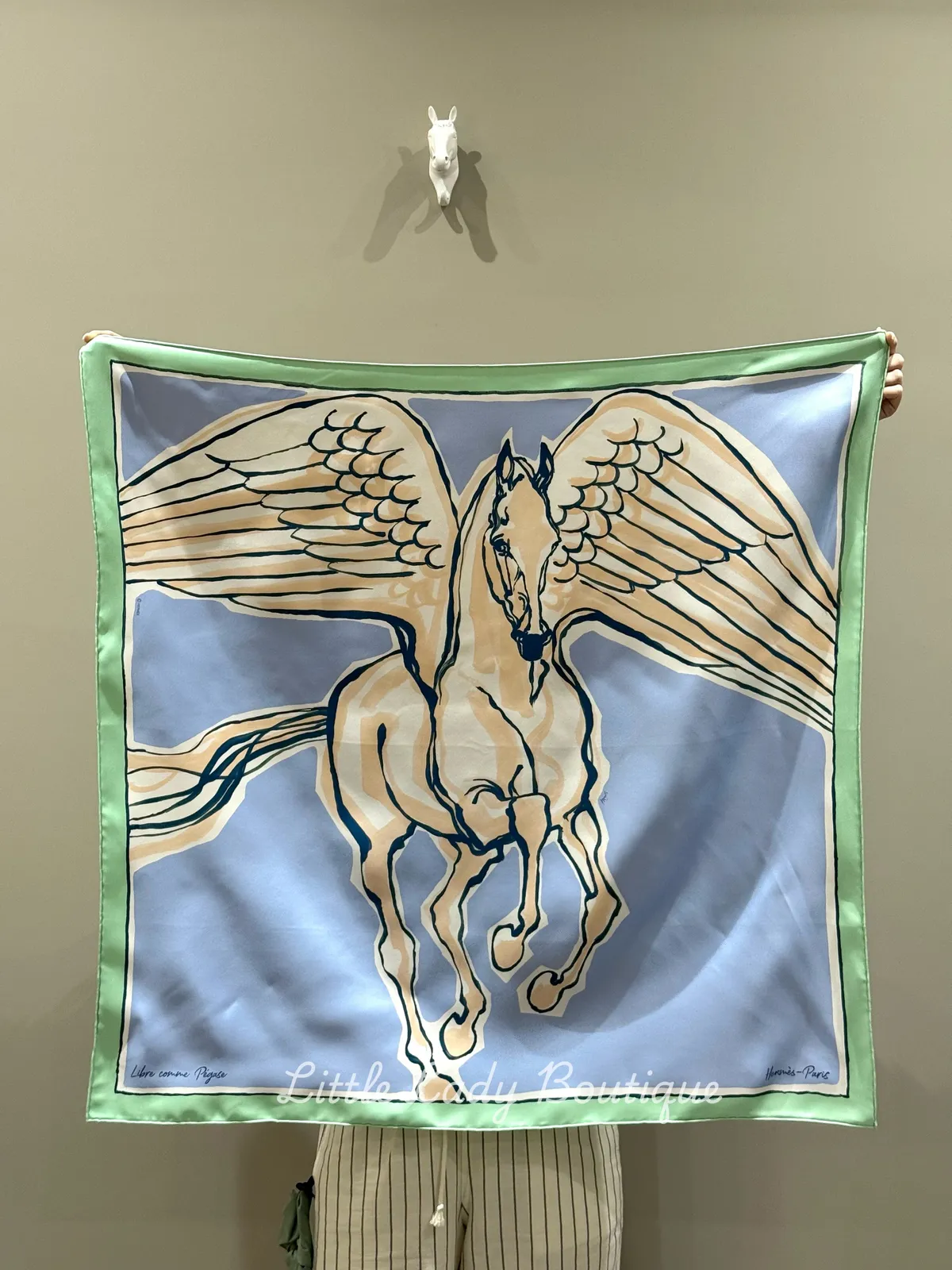 HERMES 90*90 絲巾 自由大飛馬(水綠 / 藍色 / 玫瑰珍珠) (100%絲)
