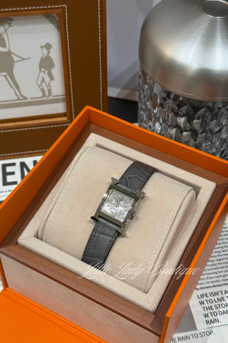 25MM HERMES HEURE H 銀釦 錶盤幾何H造型 霧面鱷魚 錫器灰 皮錶帶 手