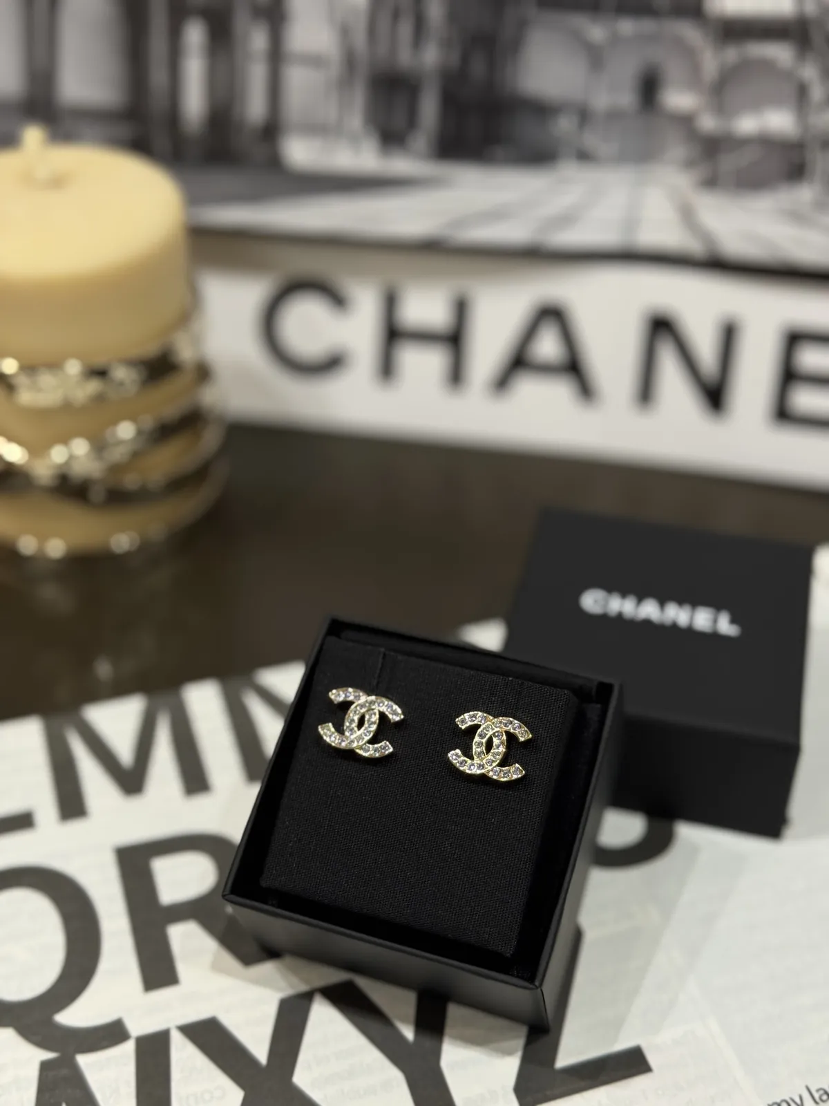 CHANEL 金邊雙C字 鑲水藍鑽 貼耳針式耳環(1.6*1.2CM)