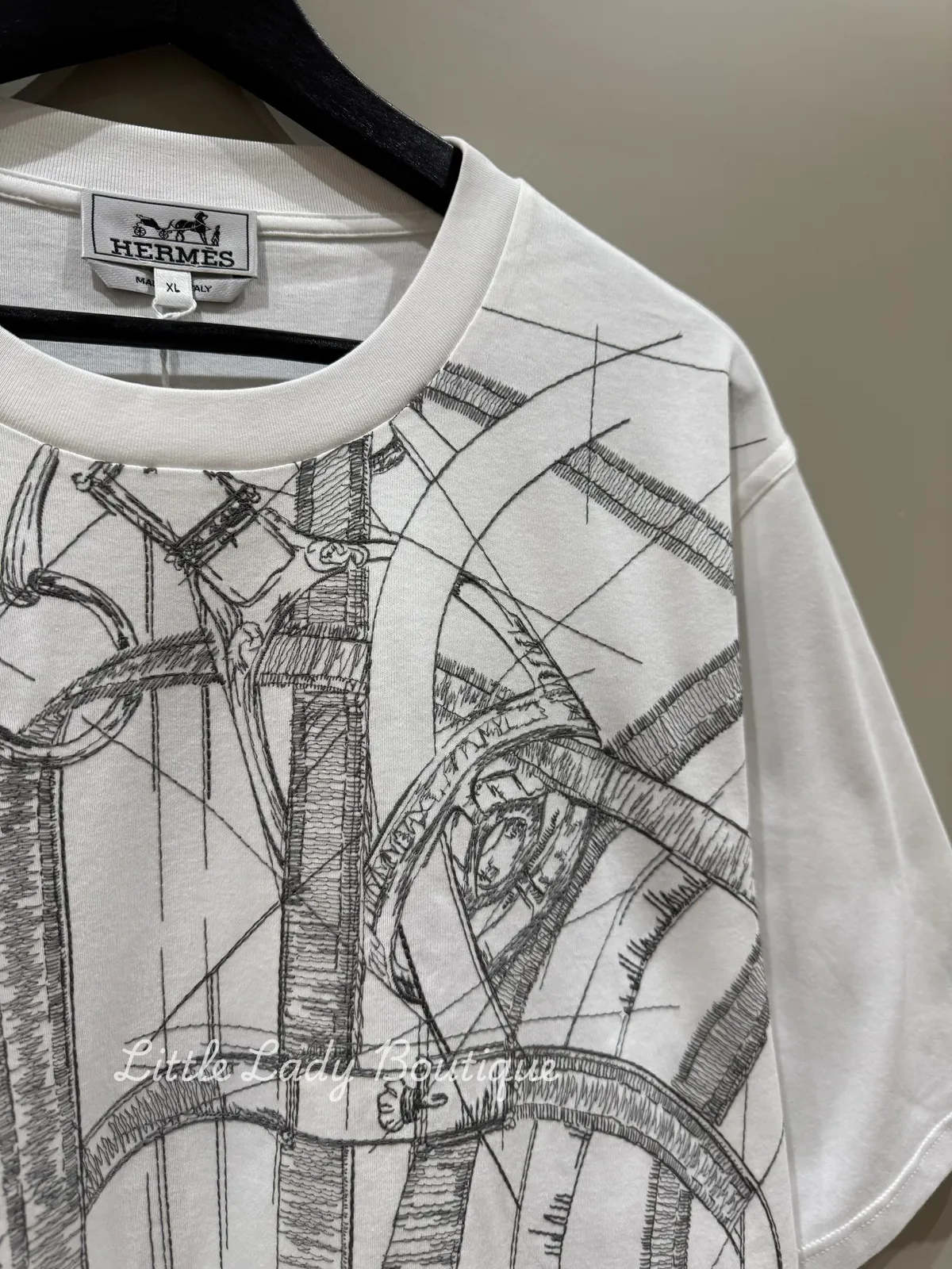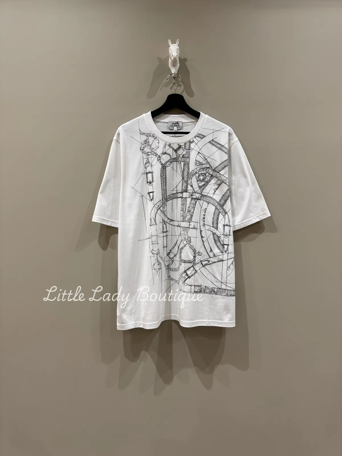 HERMES 男士 白底 素描縫線 馬具圖案 短袖上衣 (100%棉)