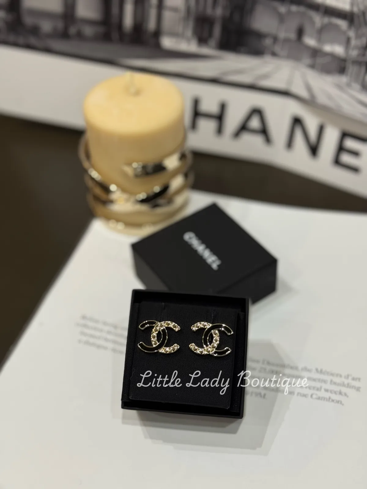 CHANEL 金邊 菱格&黑色 雙C字 貼耳針式耳環