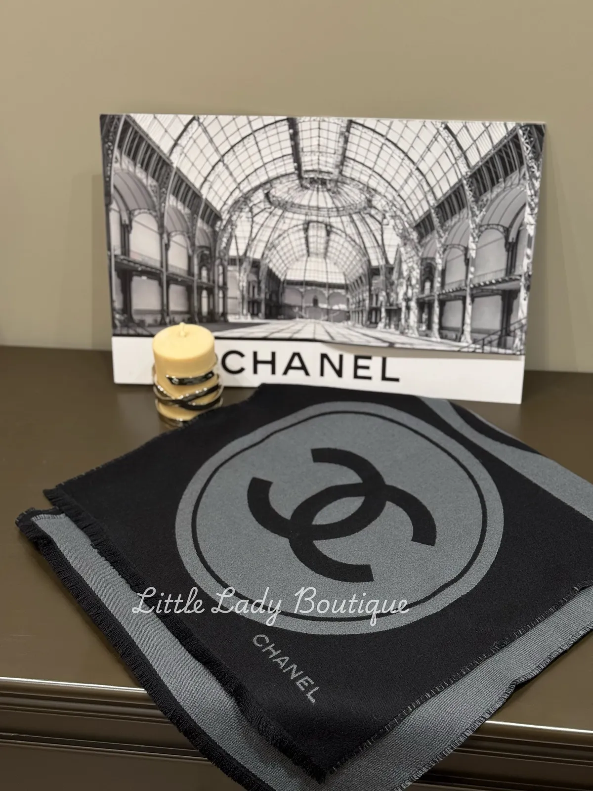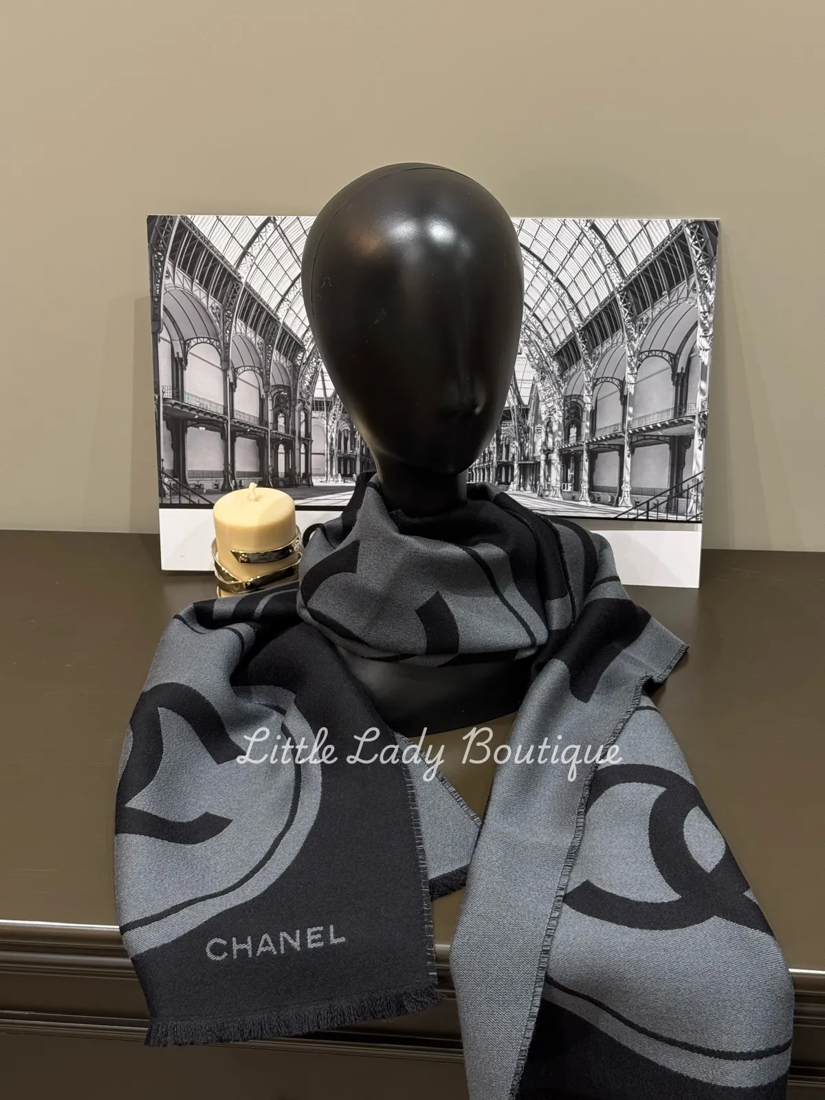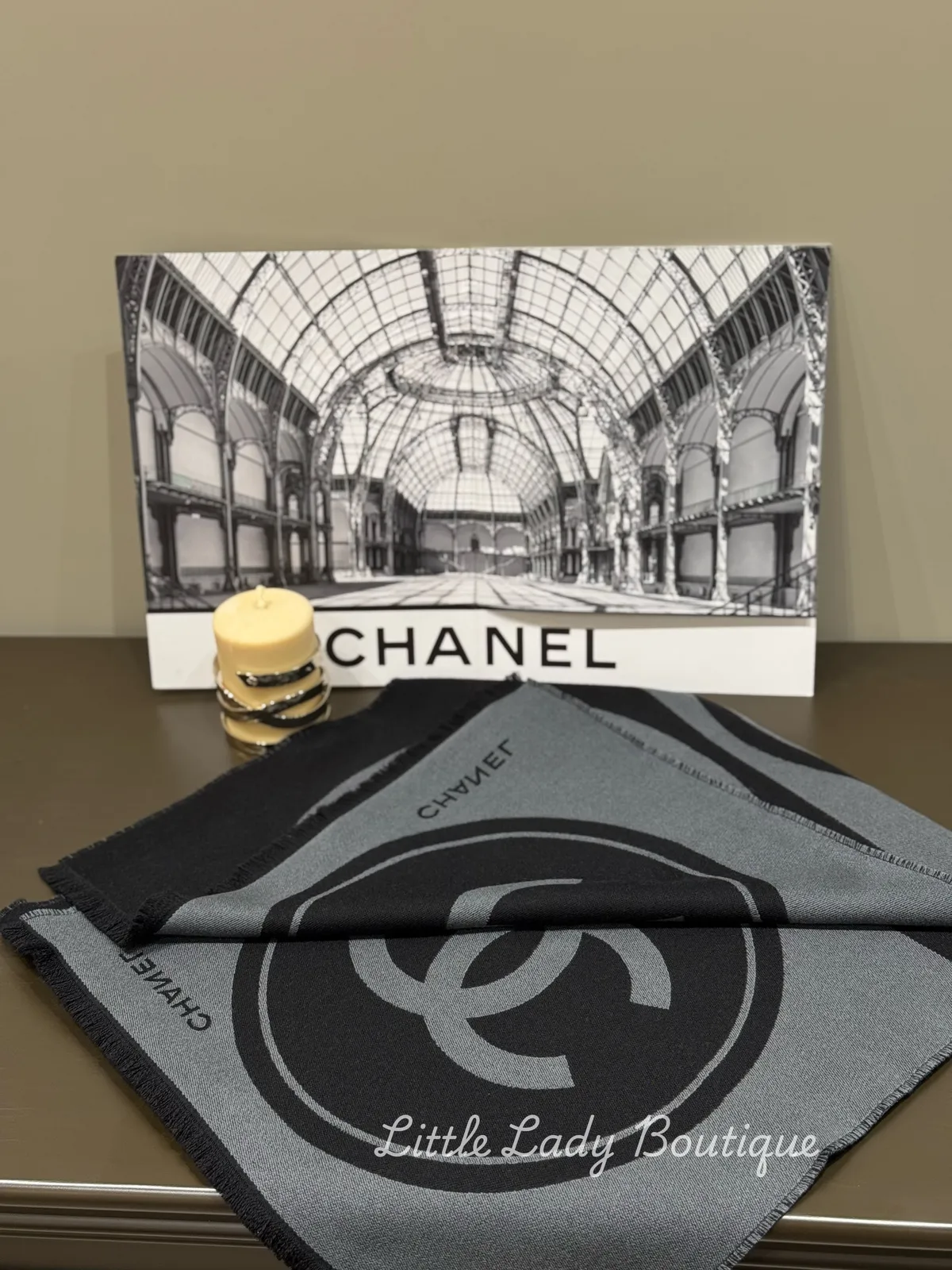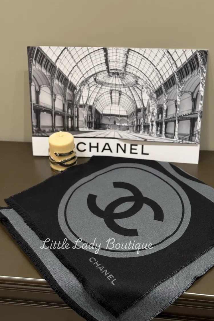 CHANEL 黑底 灰色圓圈雙C字 雙面 長型圍巾(100%WOOL)