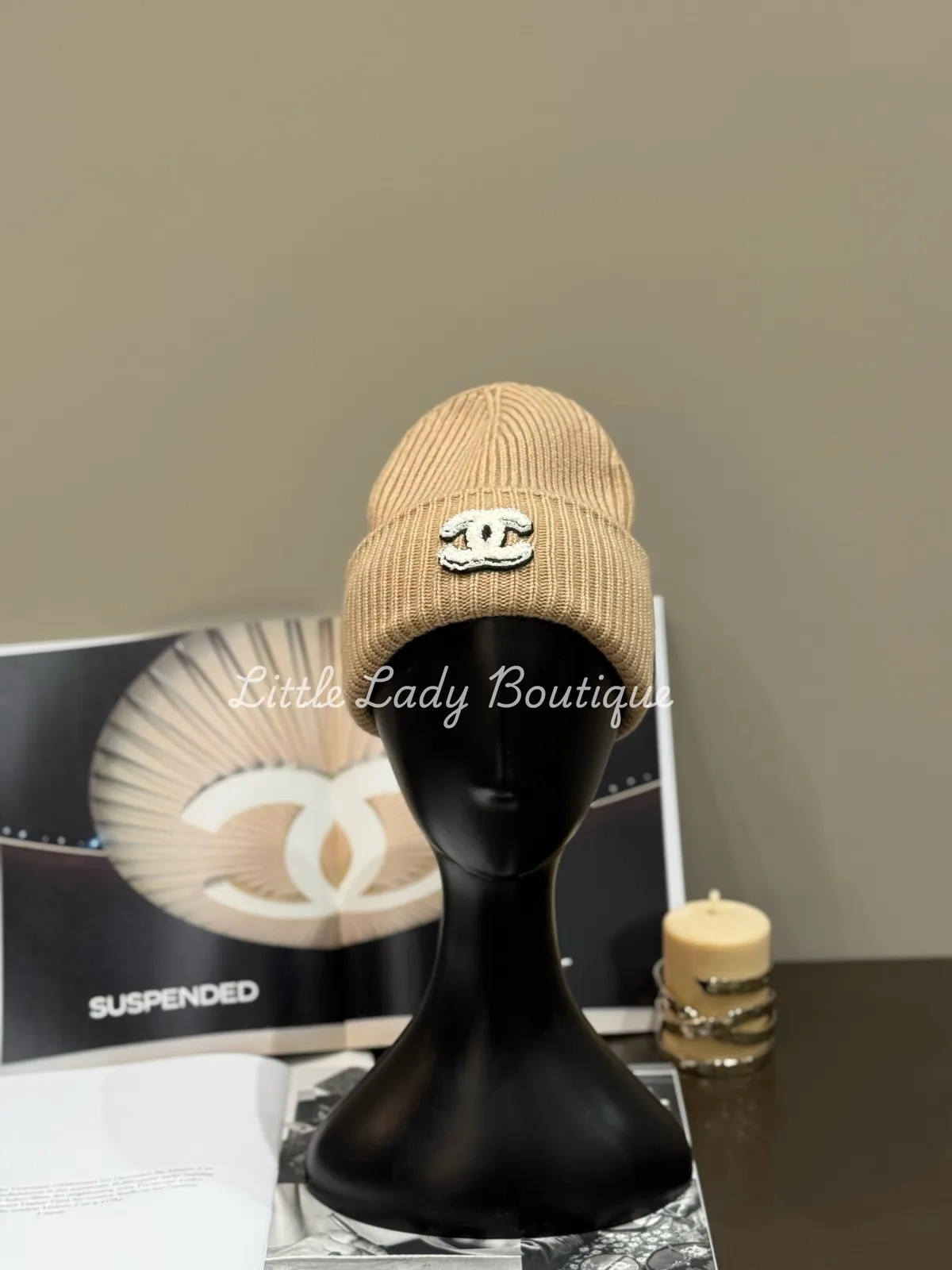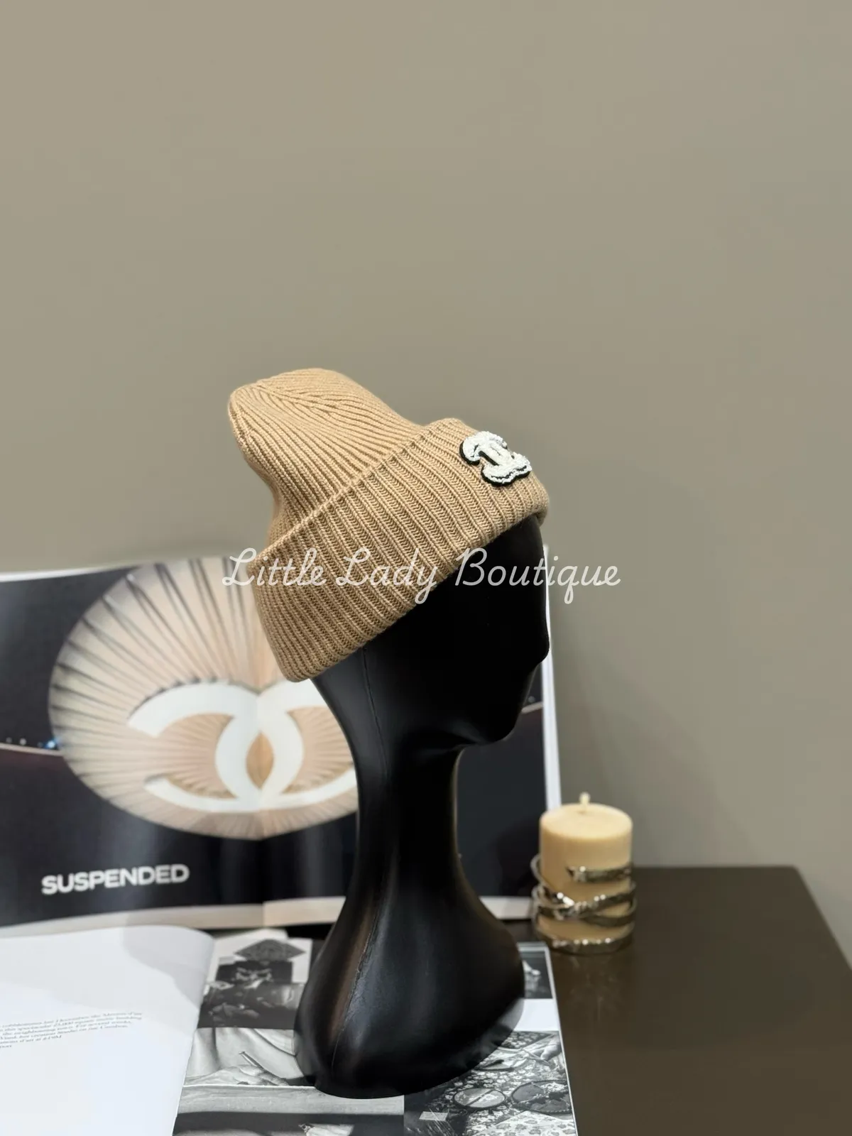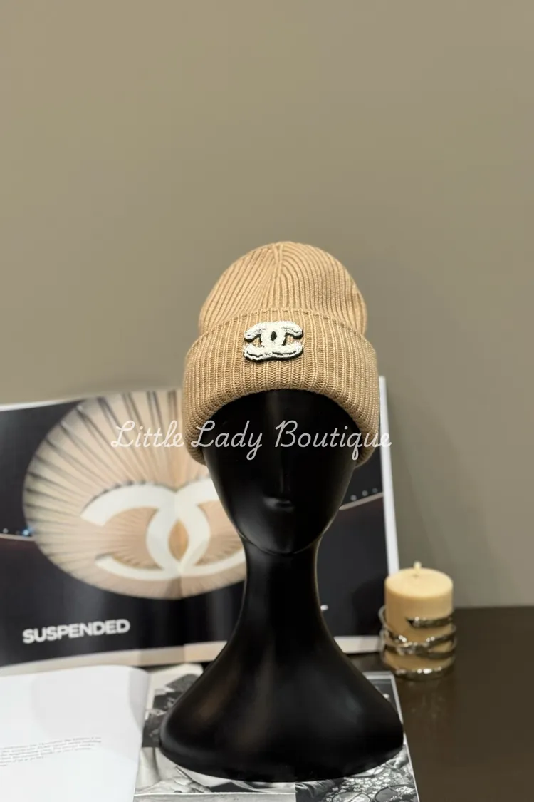 CHANEL 駝色 白毛巾布造型雙C字 針織 毛帽(100%CASHMERE)