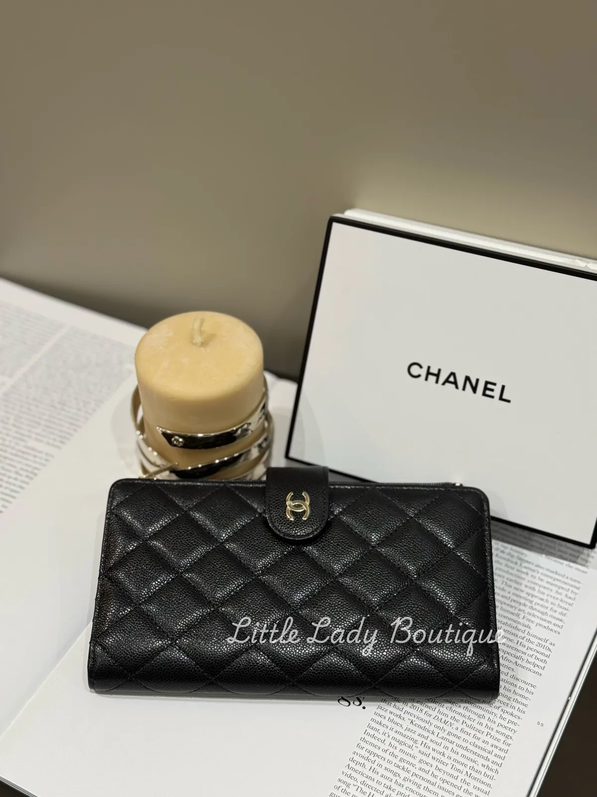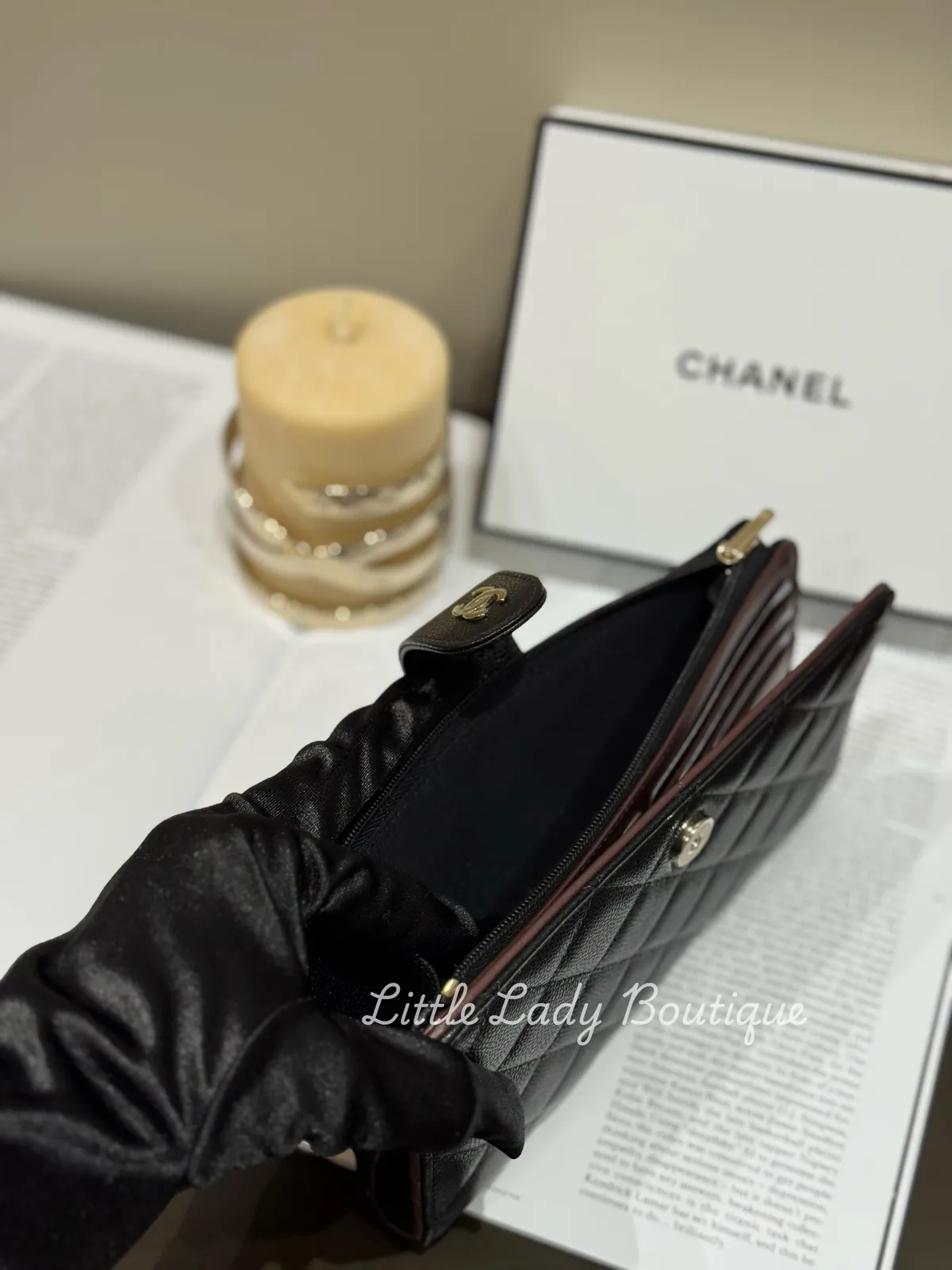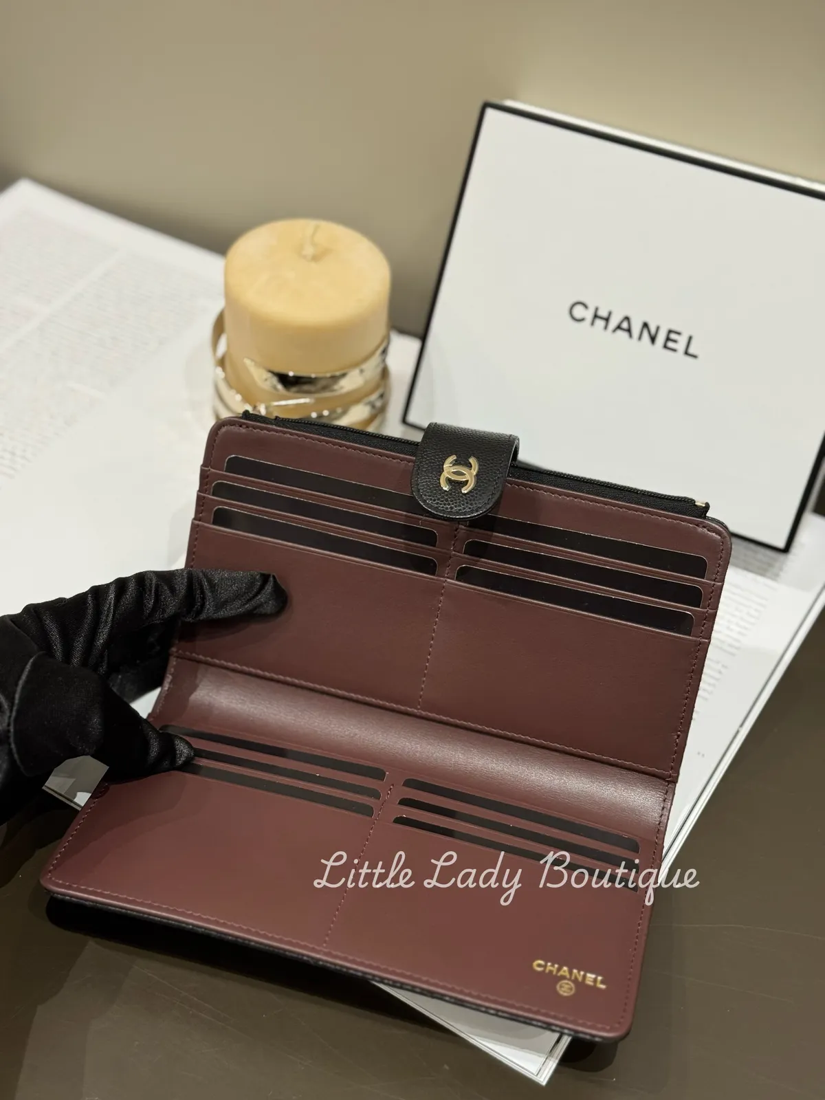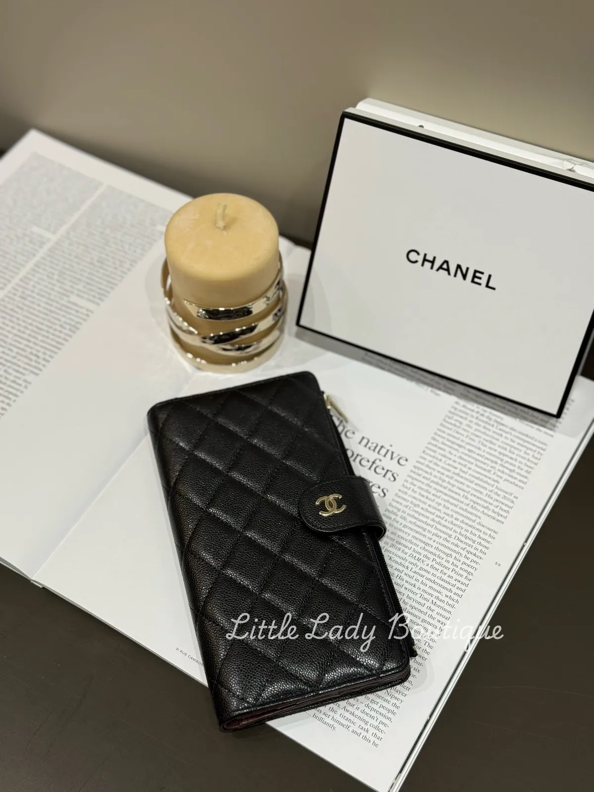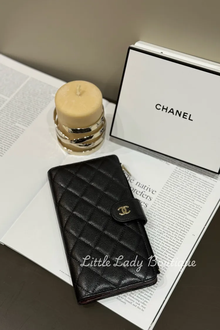 CHANEL 金色雙C 黑色荔枝牛皮 菱格紋 側邊拉鍊夾層 翻蓋長型卡夾(內12卡層)