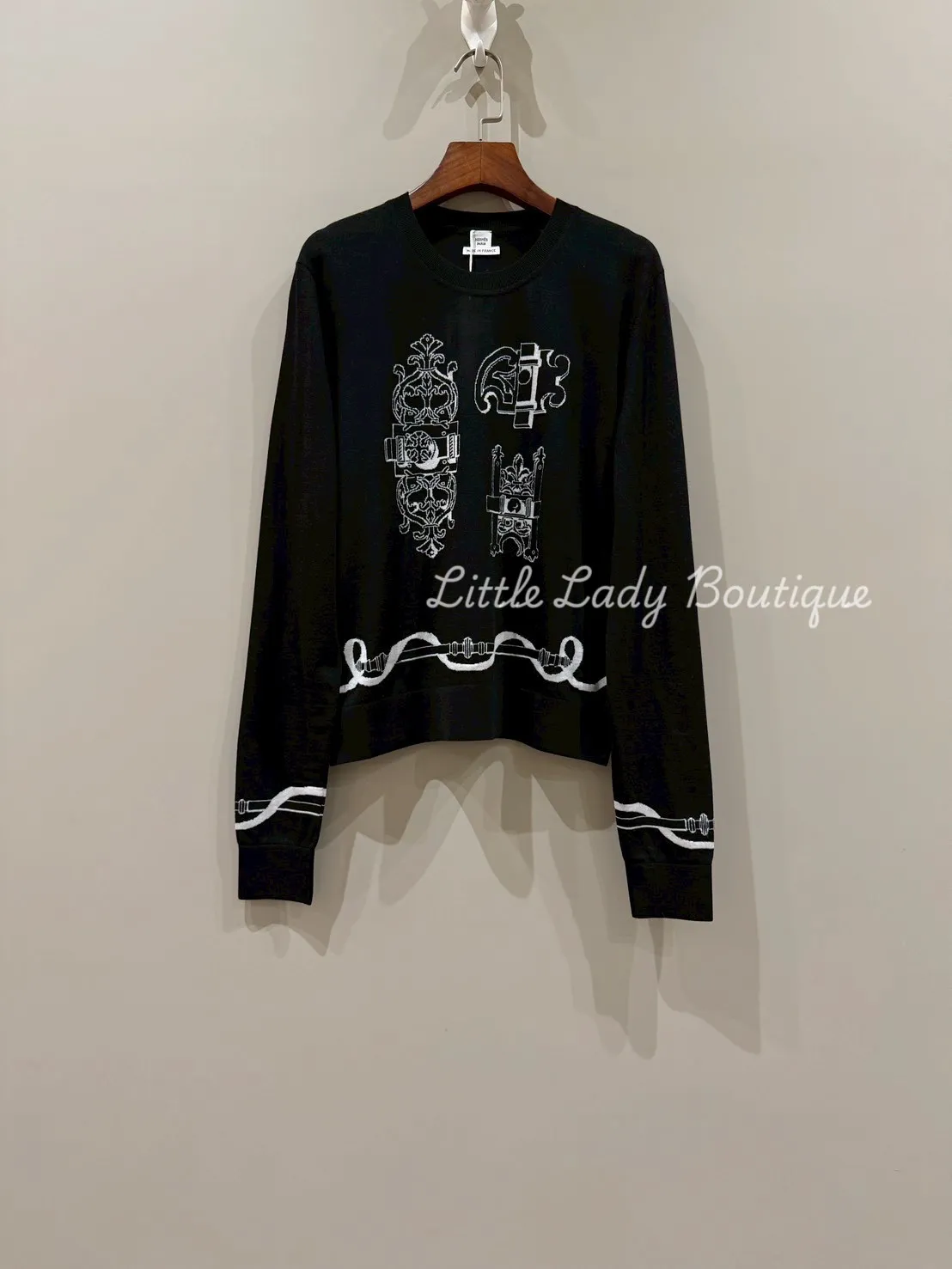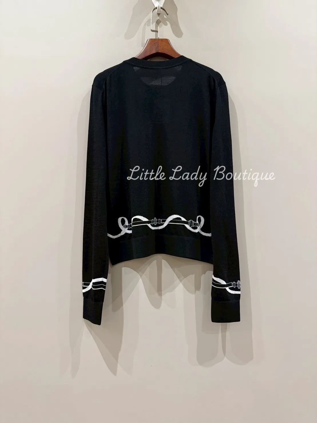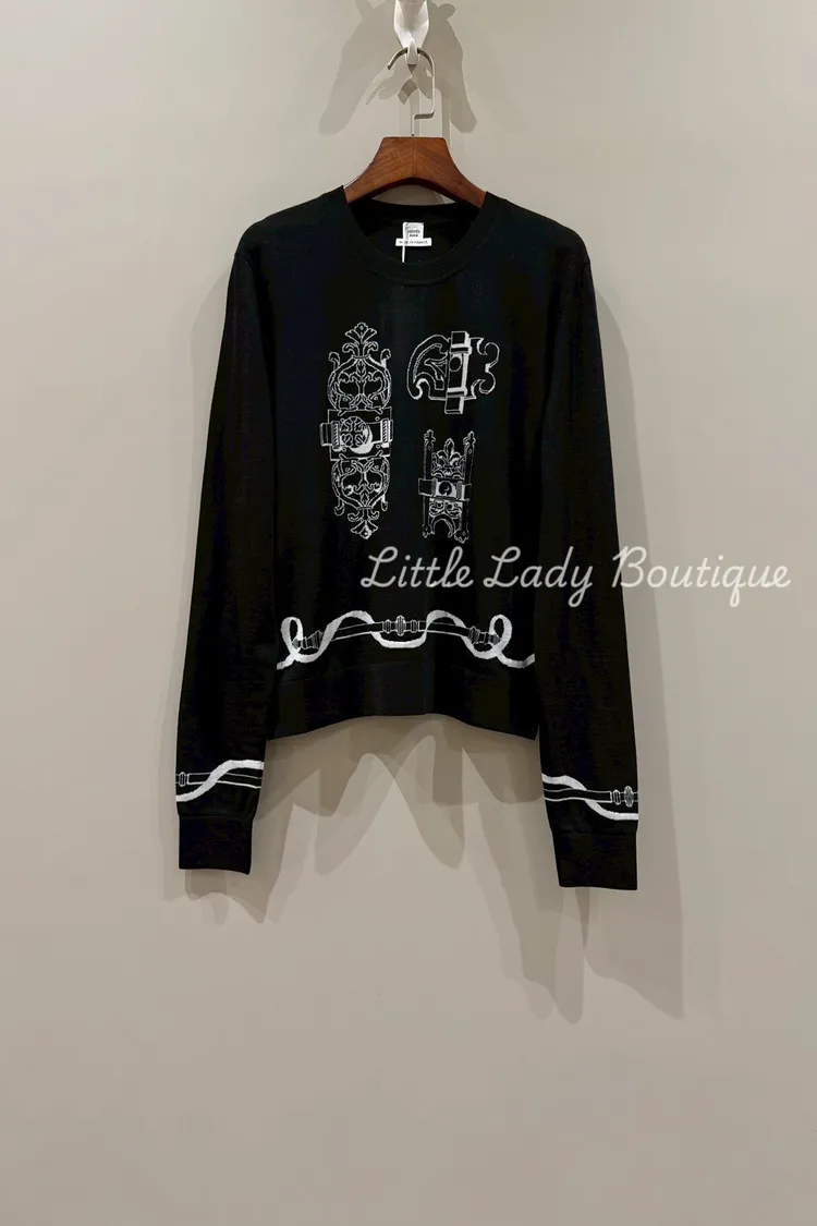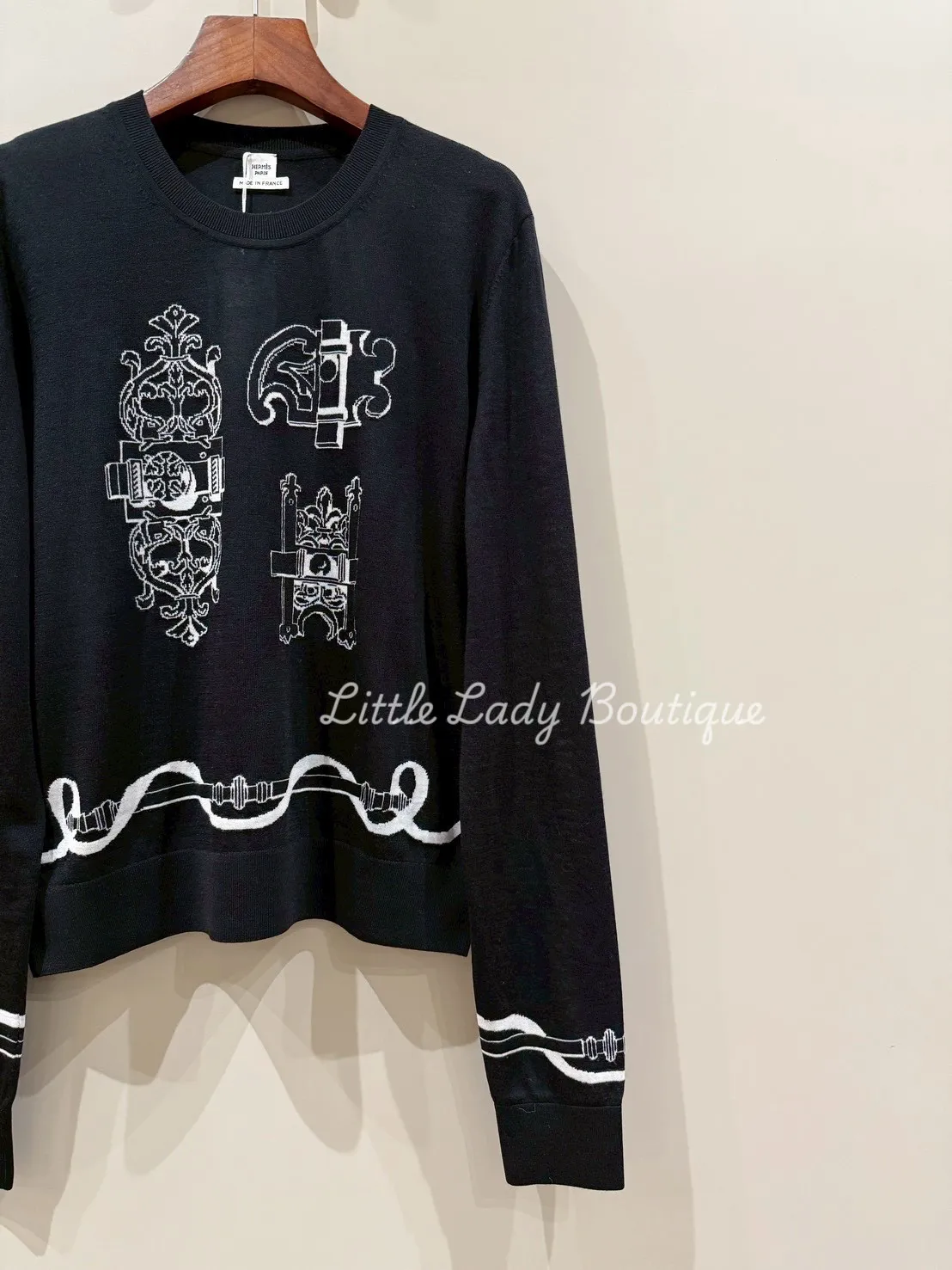 HERMES 女士 黑色 胸口前4個白&袖(鐵藝緹花圖案)長袖羊毛衣(96%羊毛+