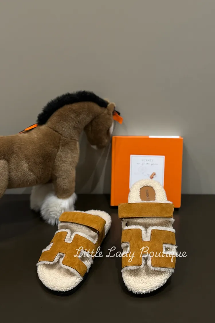 HERMES 女士 Chypre 自然色麂皮山羊皮/米白色 羊毛毛 二舅拖鞋