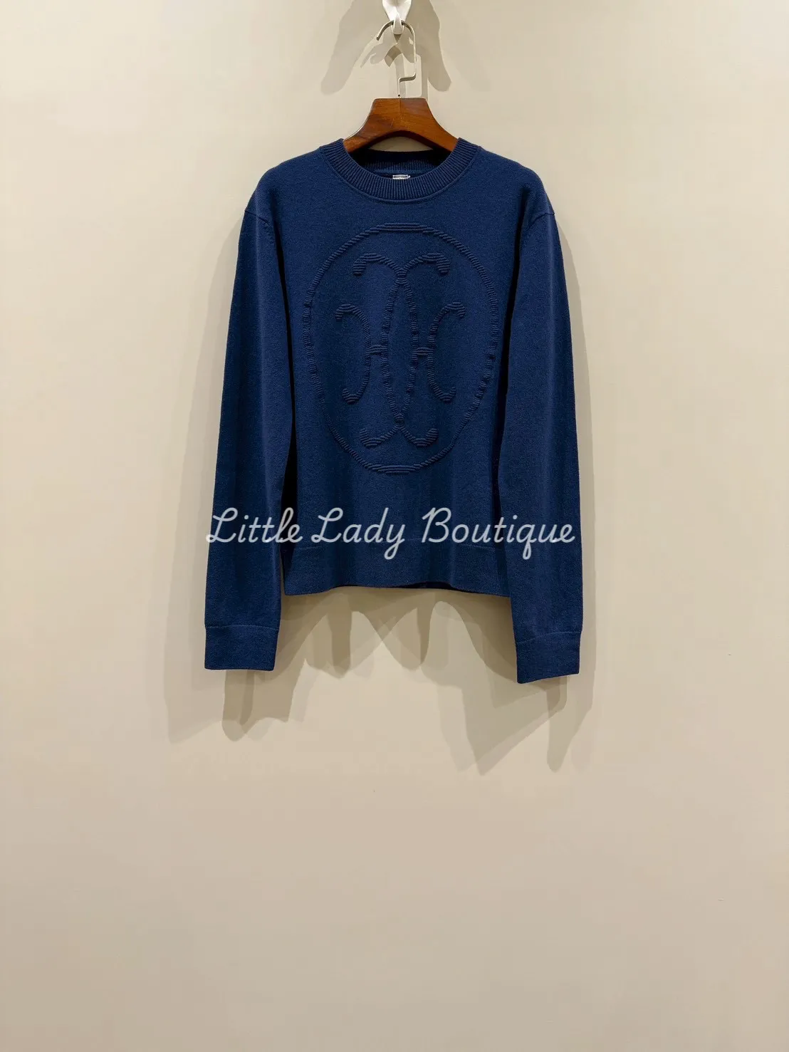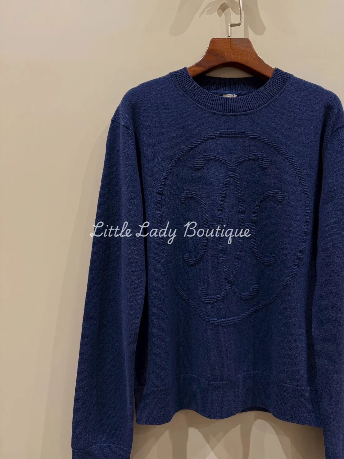 HERMES 女士 群青藍色 中間圓形雙彎H造型 圓領長袖針織上衣 (100%CASHEM