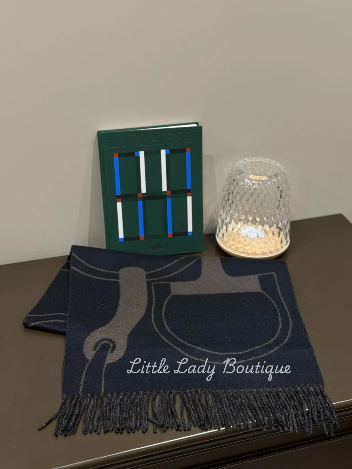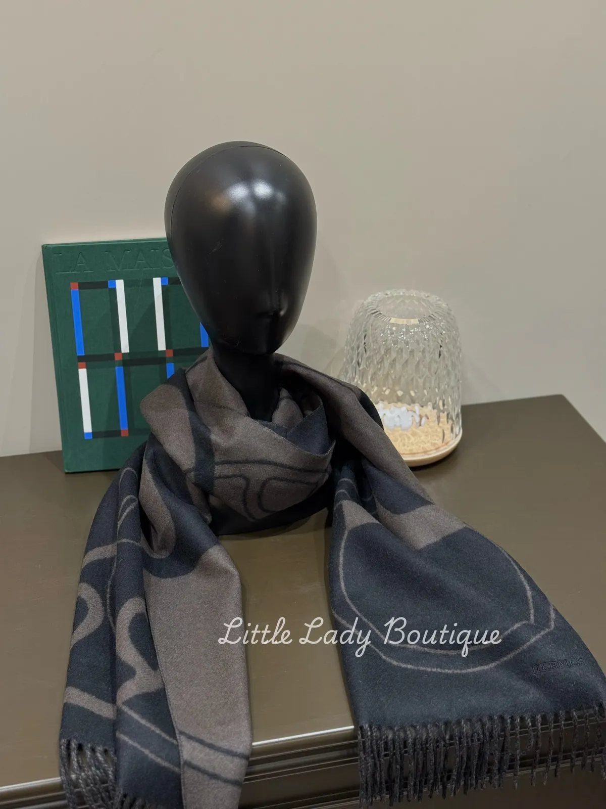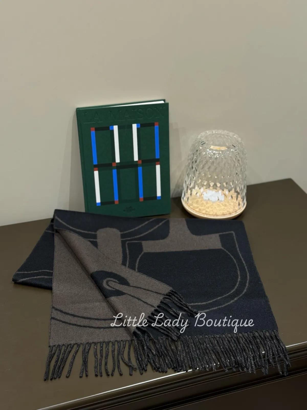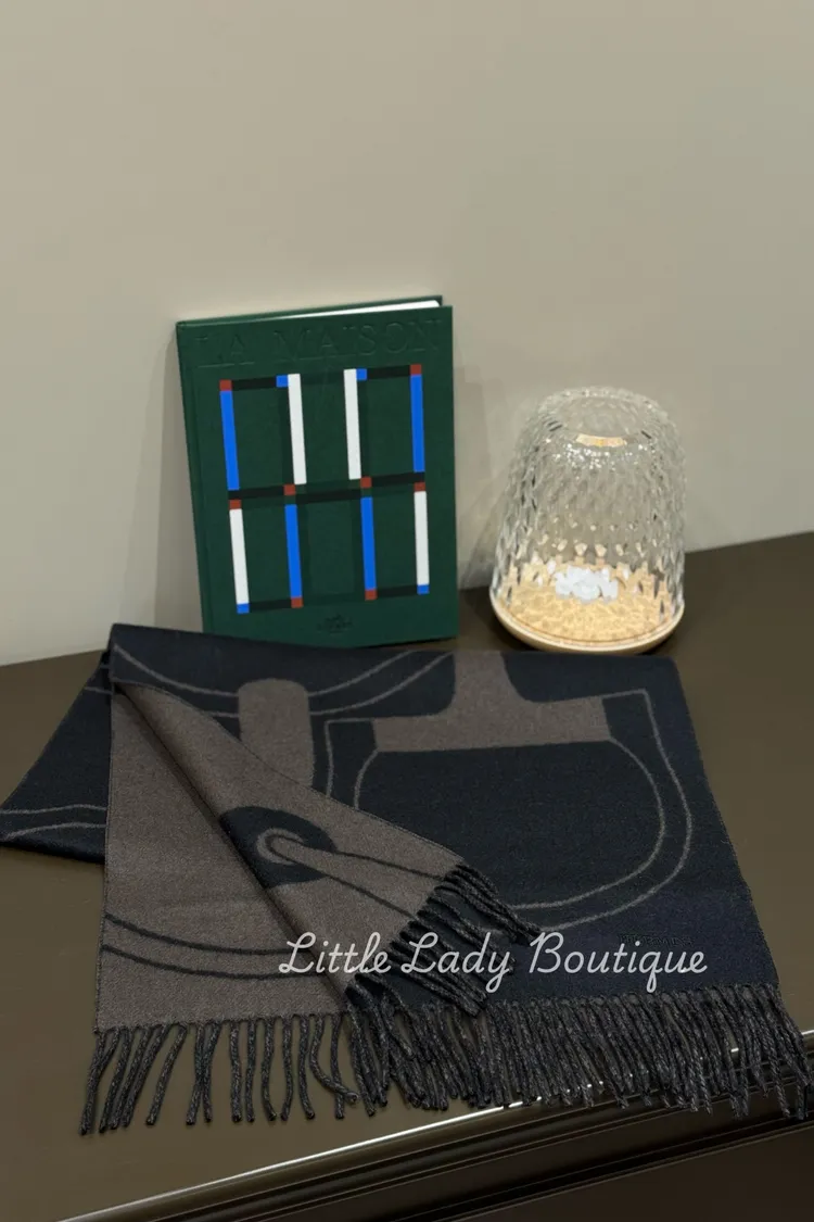 HERMES 黑/咖啡色 雙色 馬術大馬銜圖案 羊絨圍巾 (40 x 170 CM) 1
