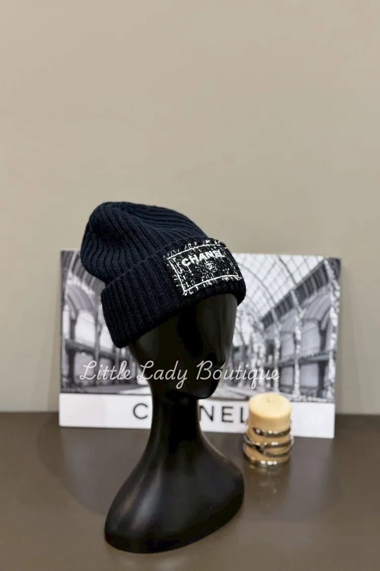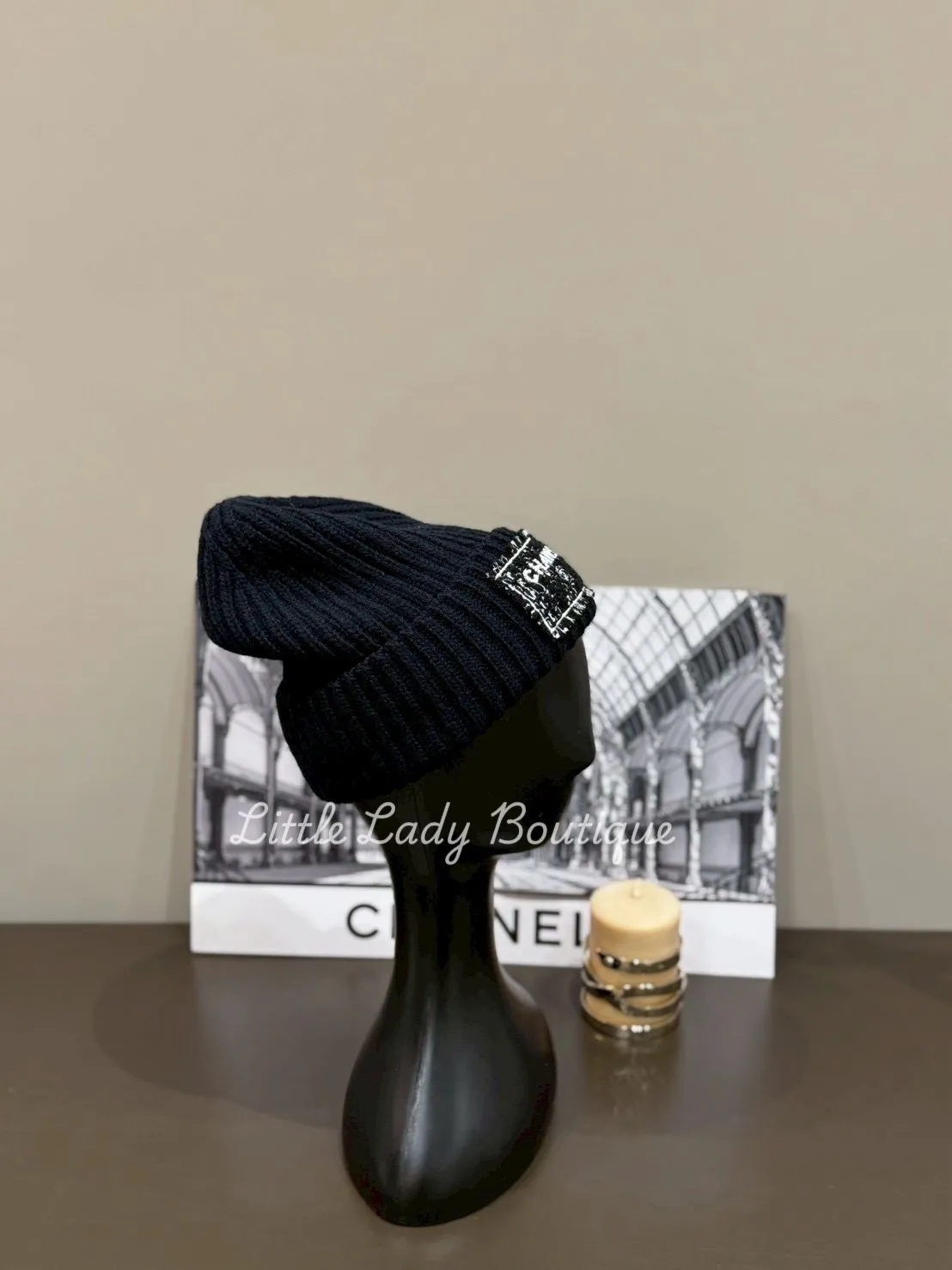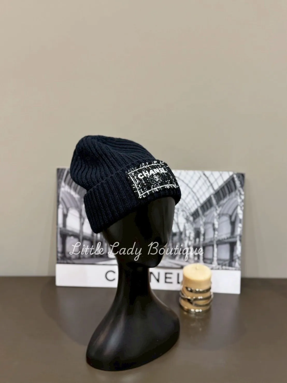 CHANEL 深海軍藍底 長方形 黑白底白線毛尼標 白珠珠CHANEL字貼片 造型 毛帽