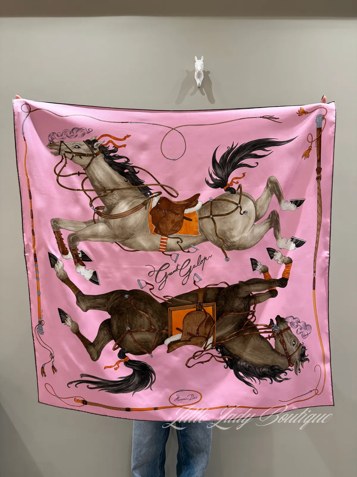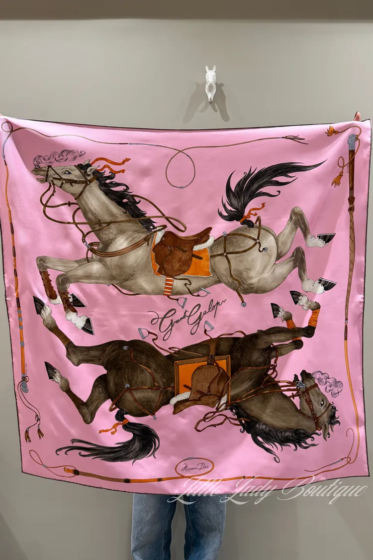 HERMES 90*90 絲巾 上下對稱奔馳馬匹(縱意馳騁) (糖衣粉 / 栗色 / 炭灰