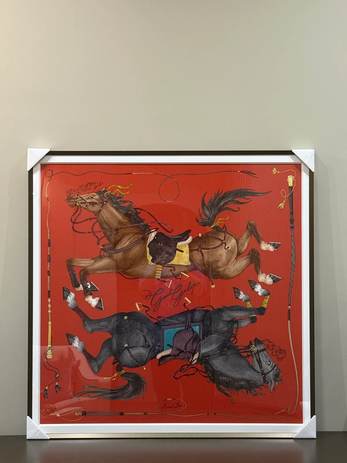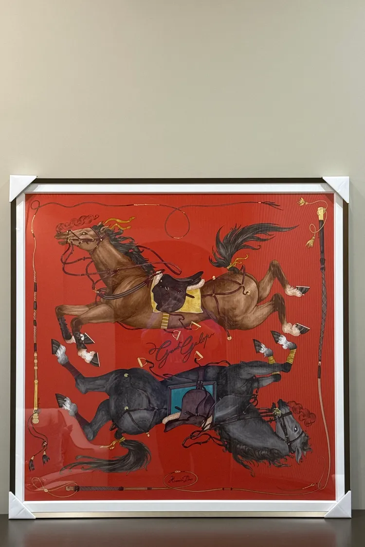 (含框)HERMES 90*90 絲巾 上下對稱奔馳馬匹(縱意馳騁) (紅色 / 皮革