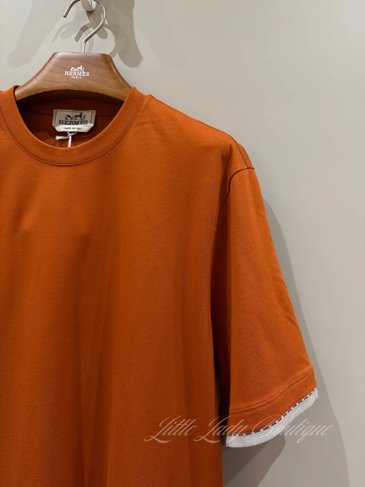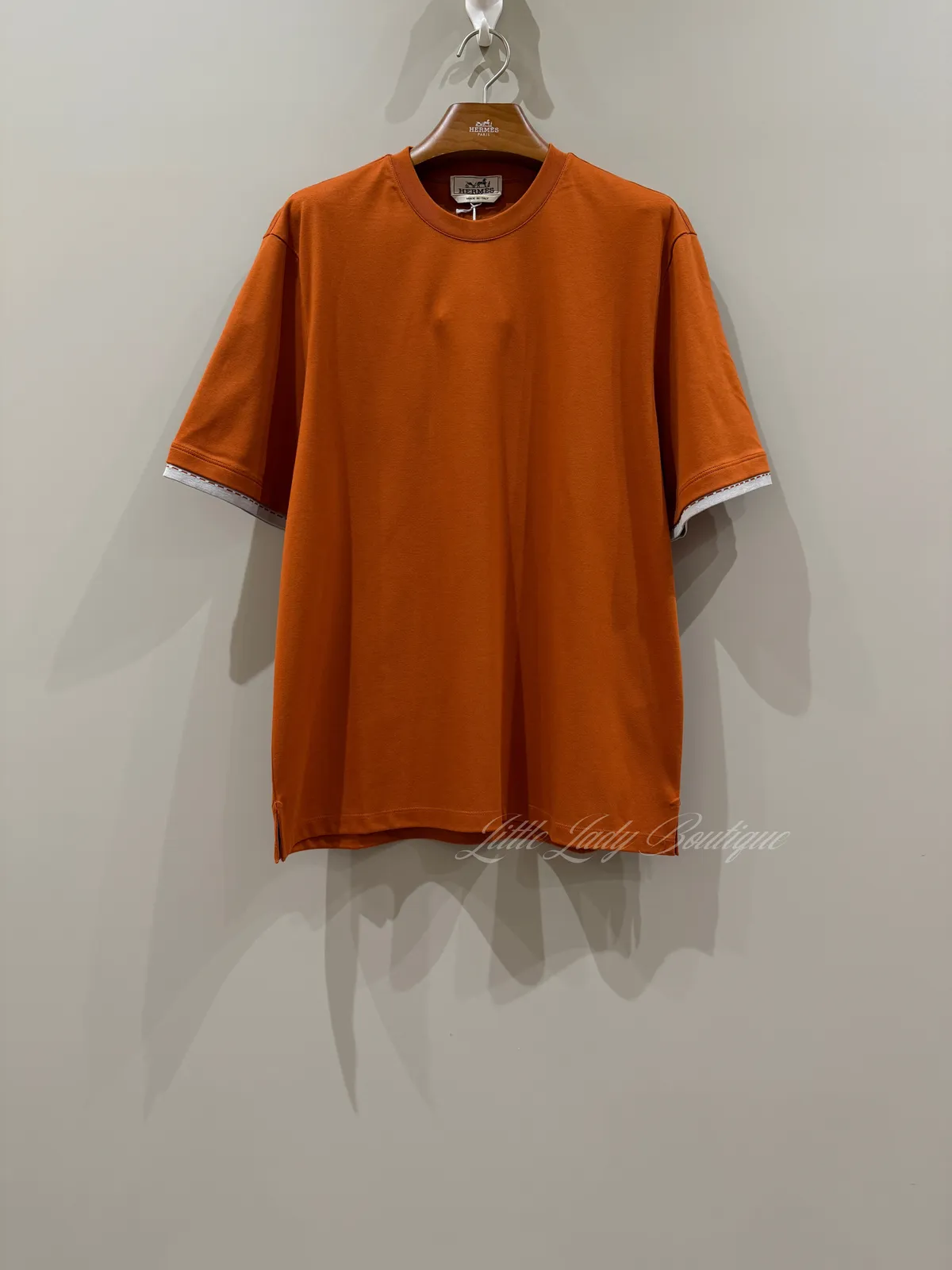 HERMES 男士 焦橙色 袖口灰色縫線細節 圓領短袖上衣(100%棉)