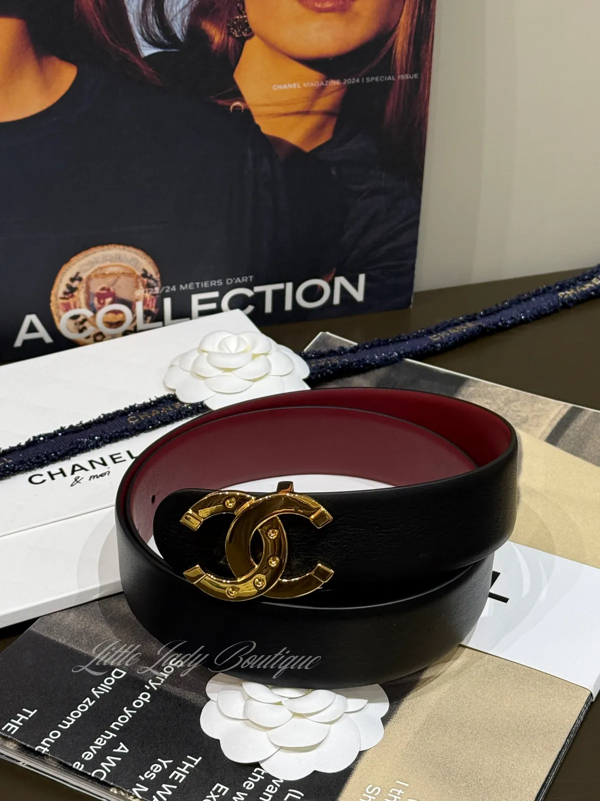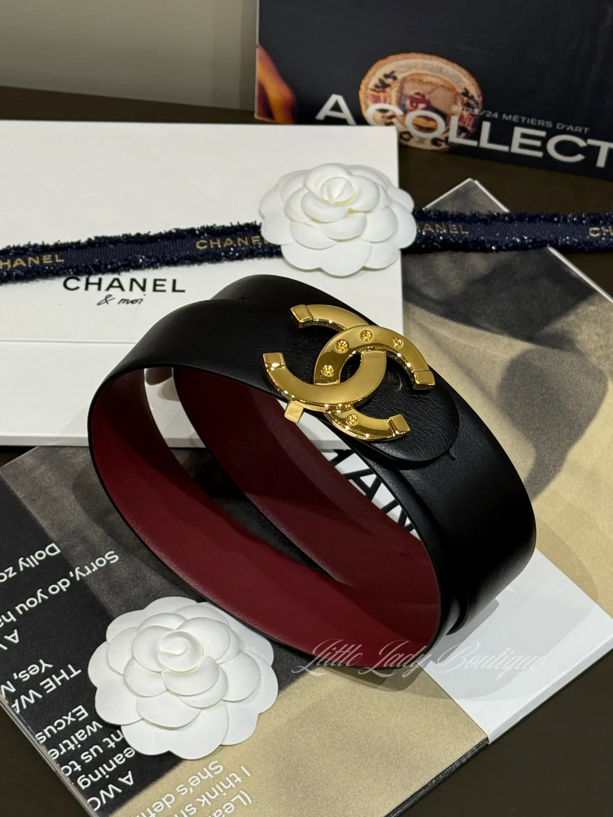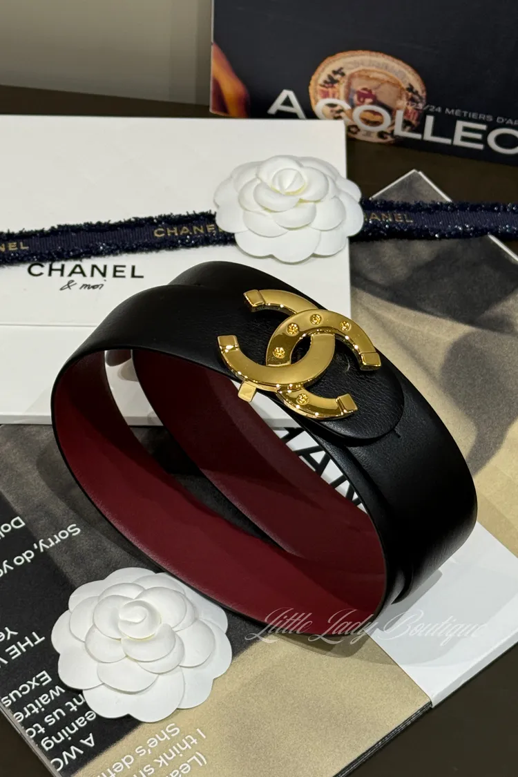 CHANEL 金釦 雙C5孔洞造型 雙面 黑/酒紅 皮帶 (80-90CM可用)