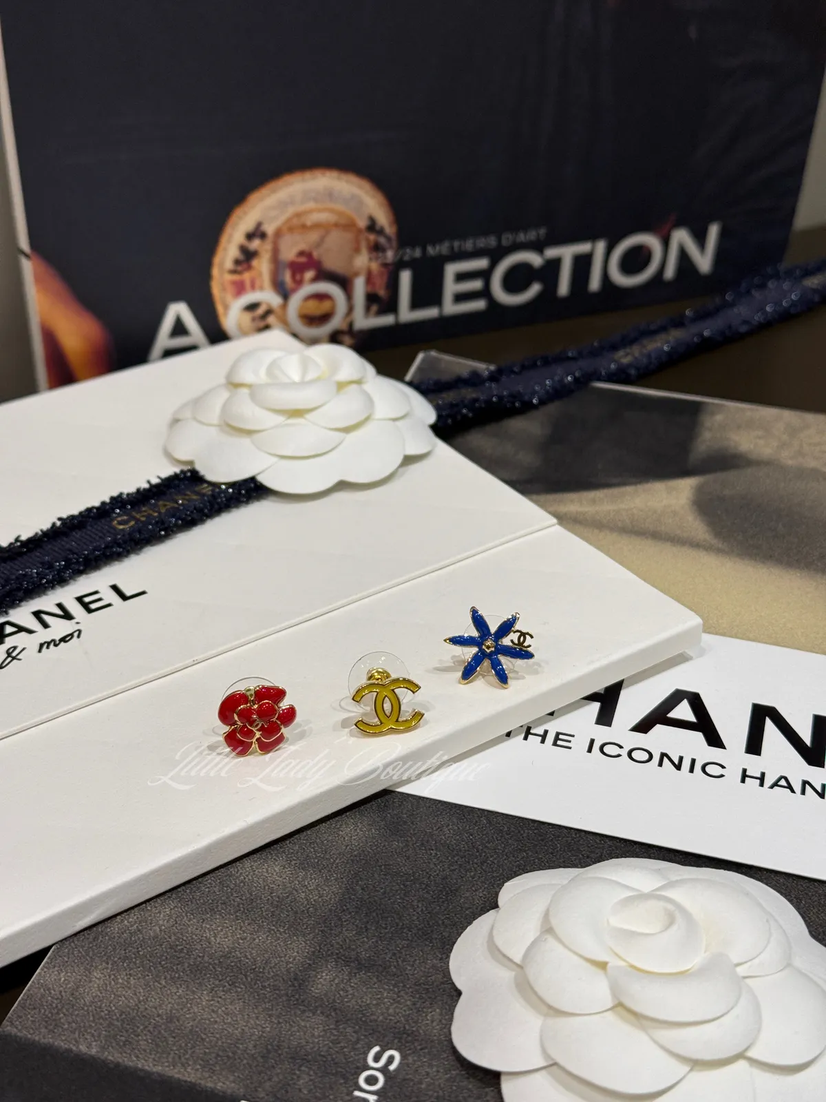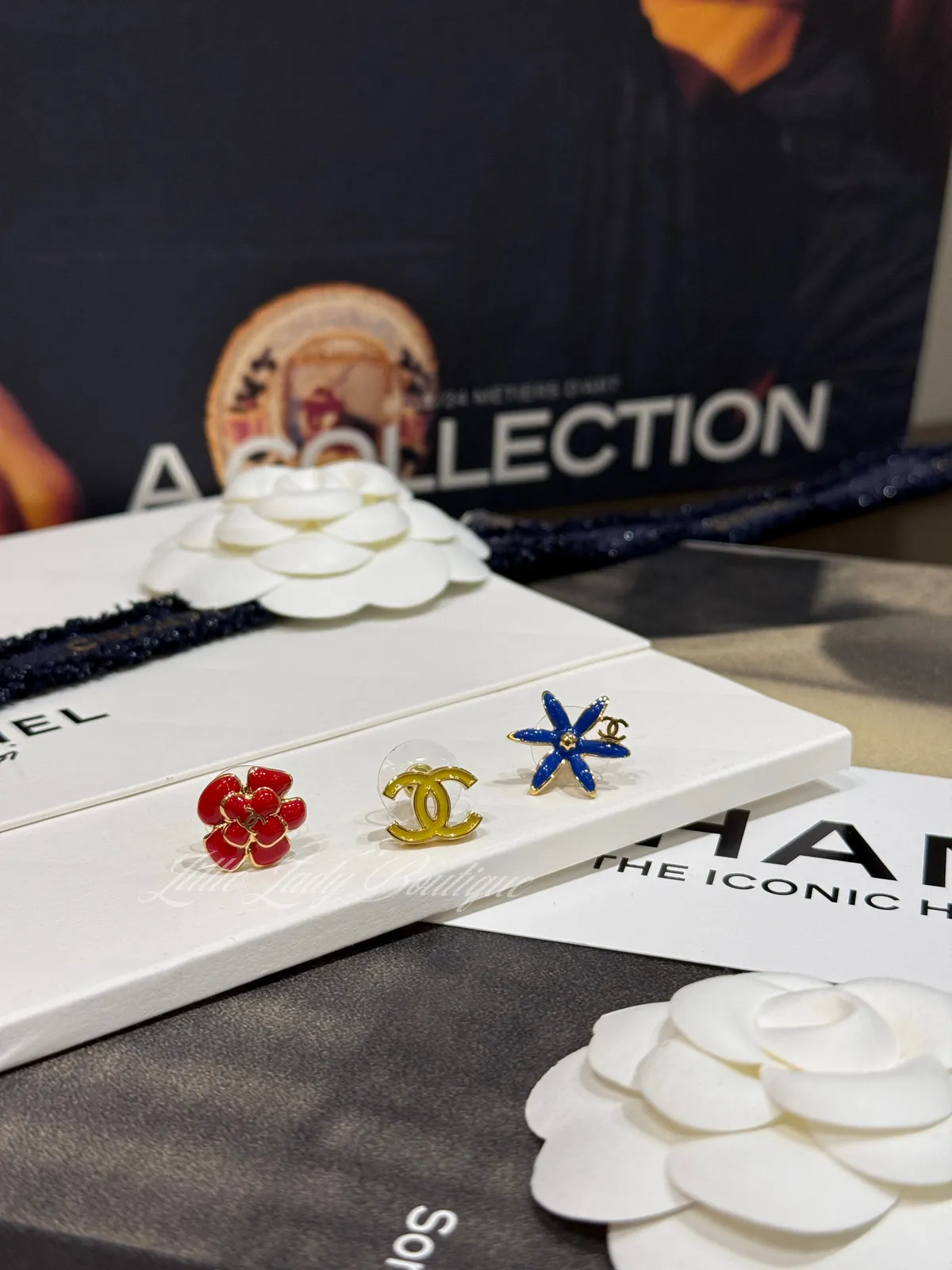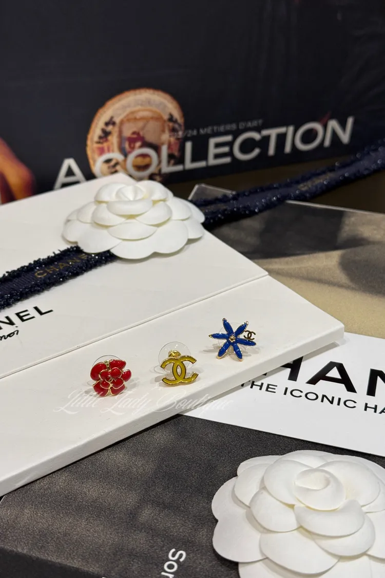 CHANEL (3個一組) 金邊藍色花/紅色山茶花/黃色雙C字 貼耳式 耳針耳環