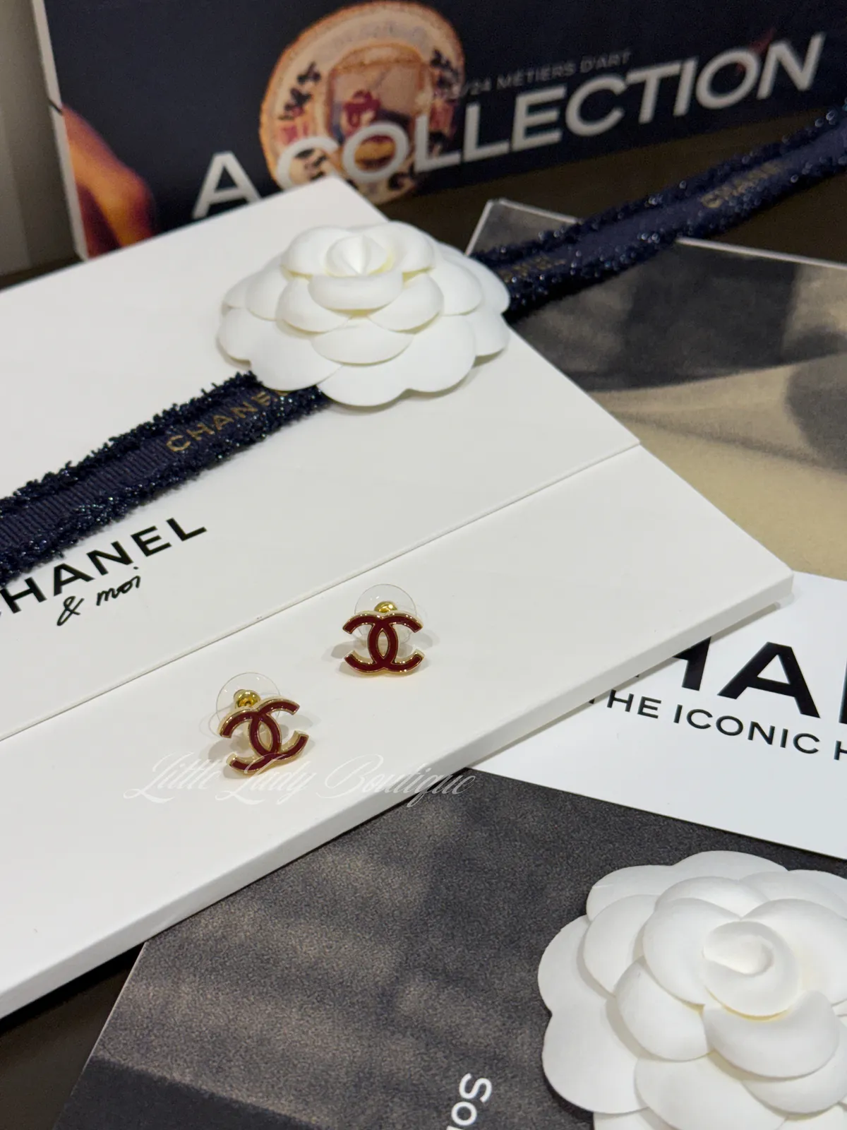 CHANEL 金邊 內暗紅色 雙C字 貼耳式 耳針耳環(1.5*1CM)