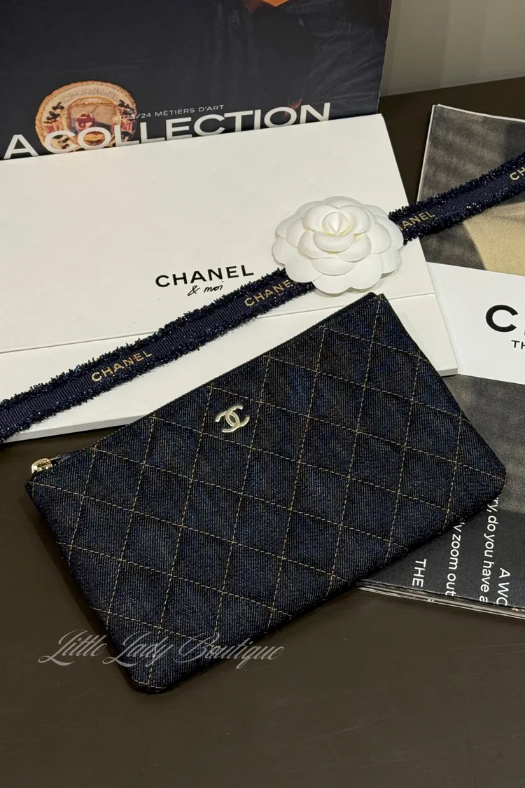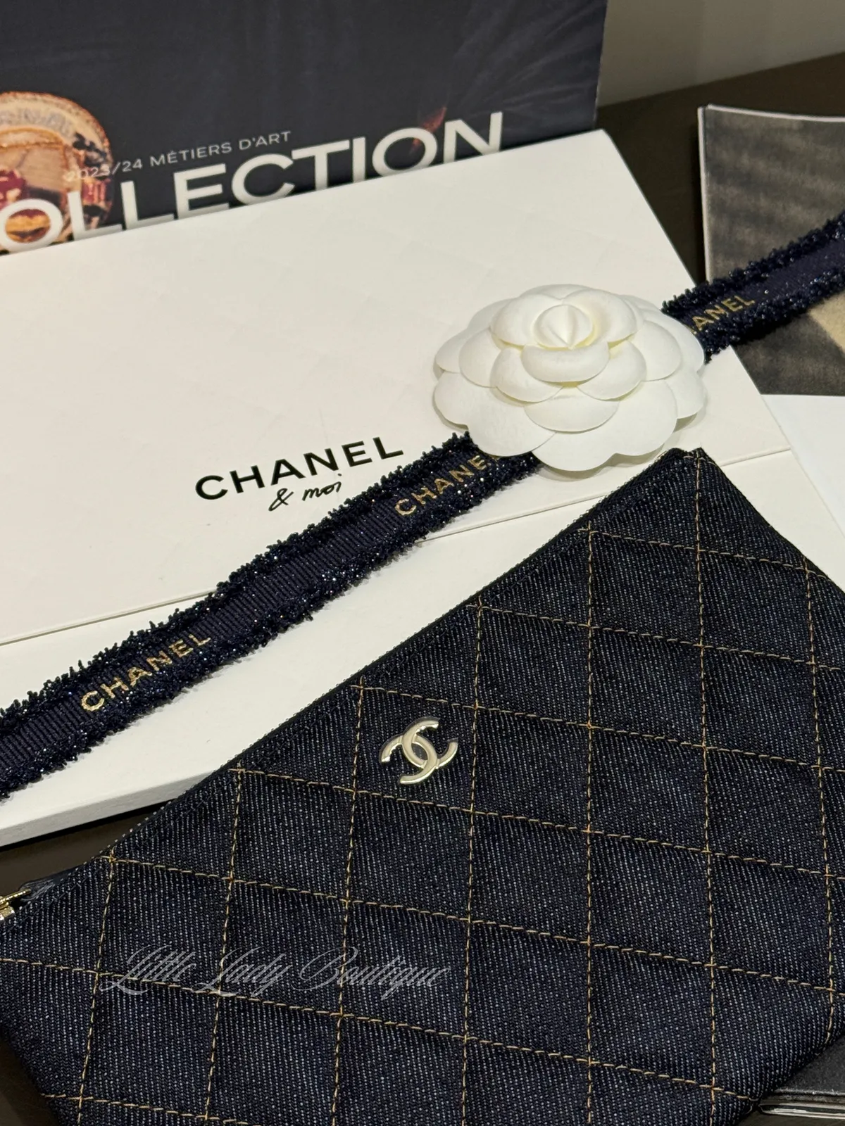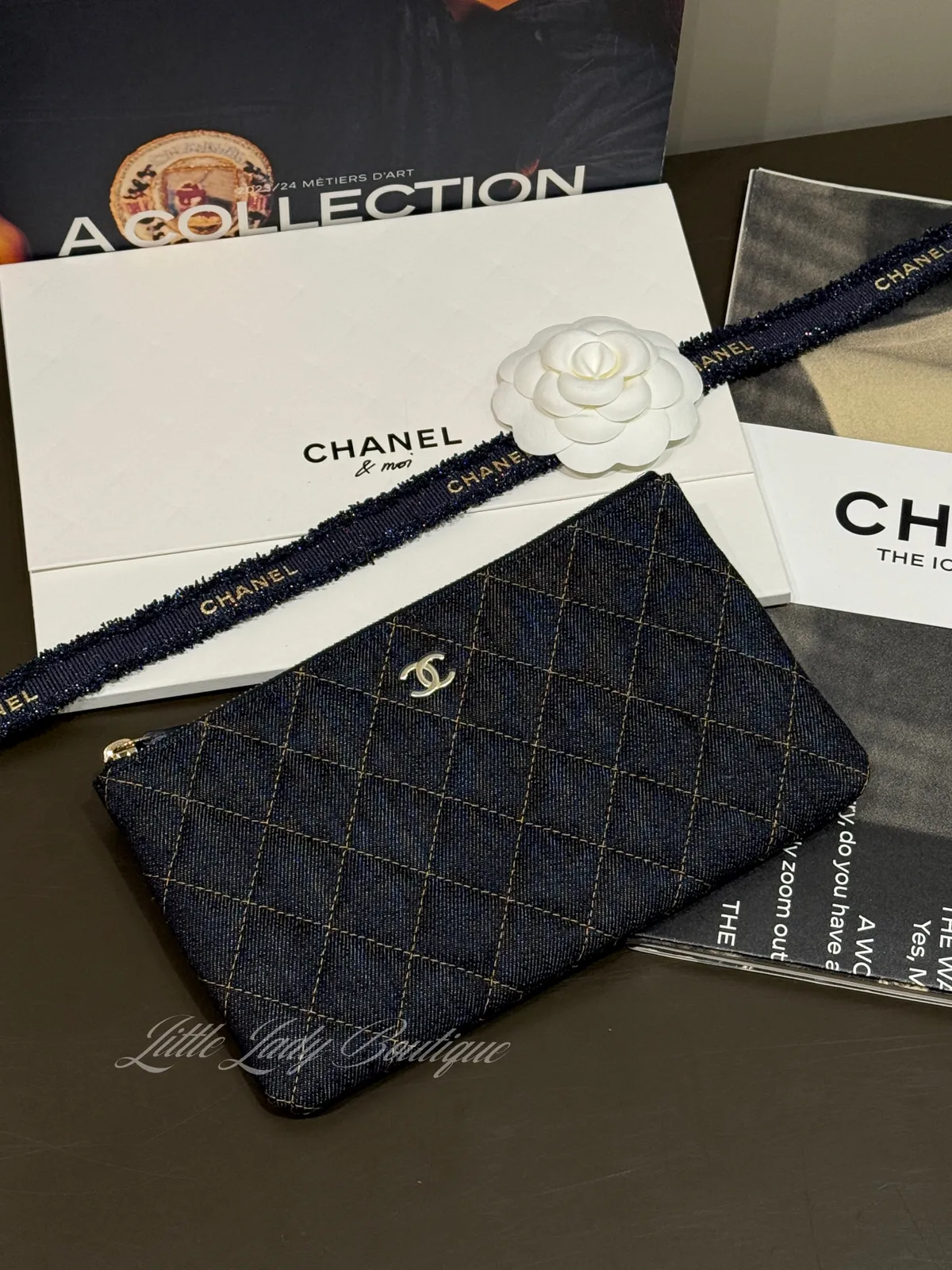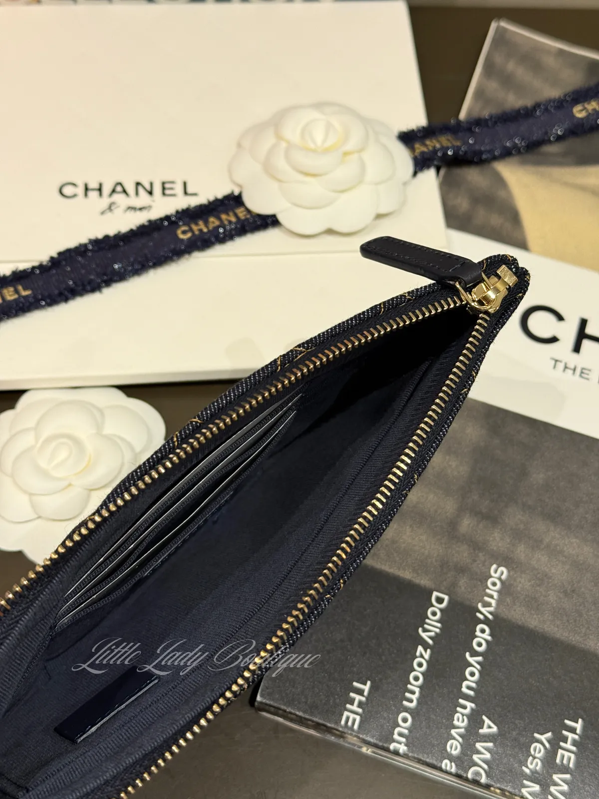 CHANEL 香檳淺金 雙C釦 深藍牛仔丹寧色 橘色菱格縫線 一字拉鍊手拿包(內3卡層1夾