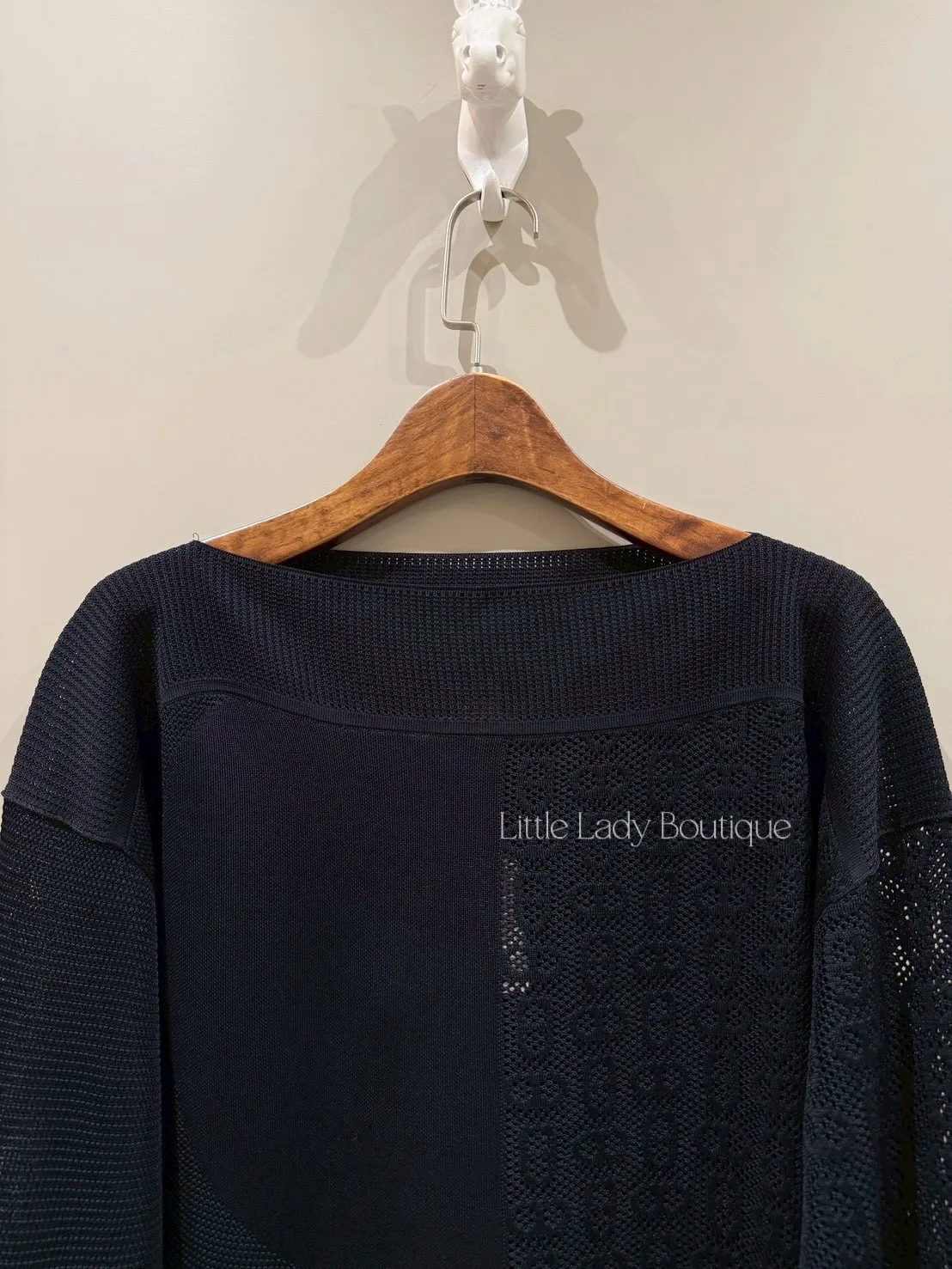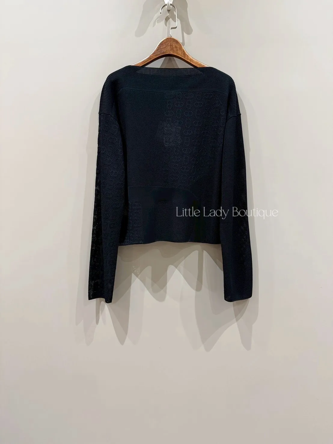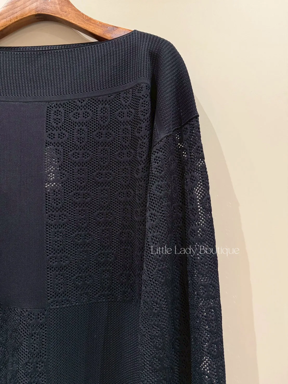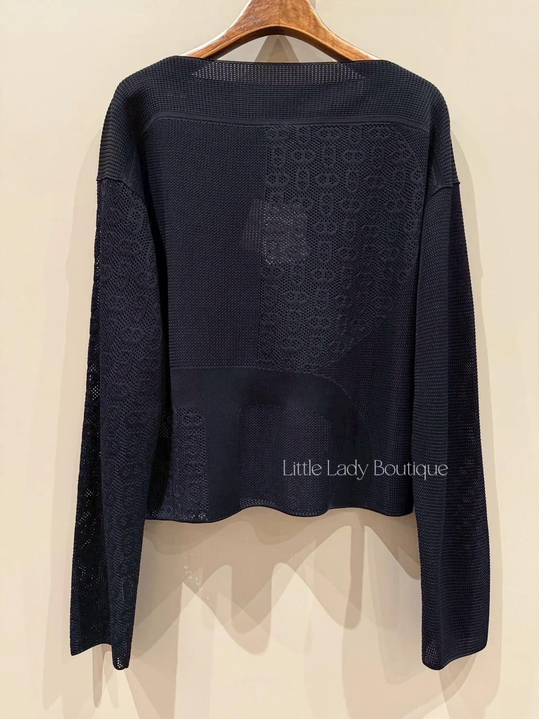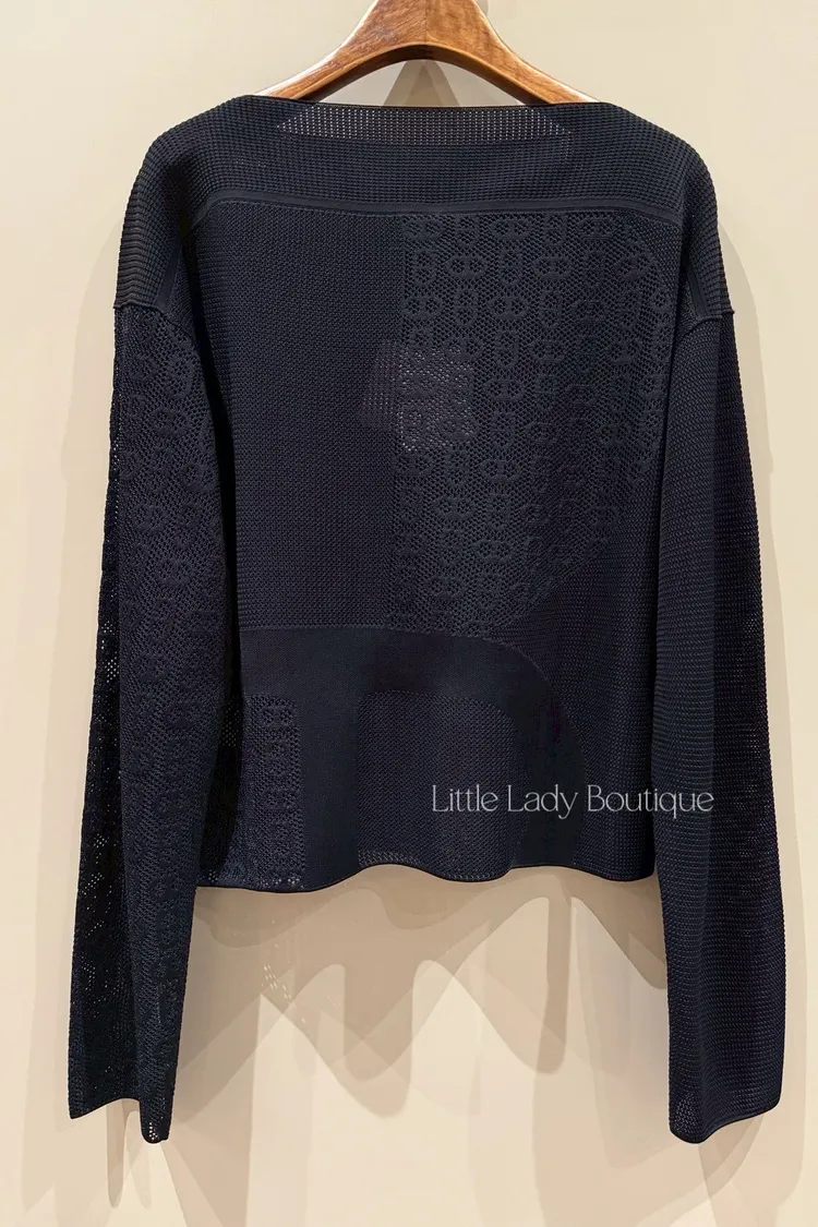 HERMES 女士 黑底 船型領口 滿版豬鼻鏤空造型 長袖針織上衣 (100%人造絲)