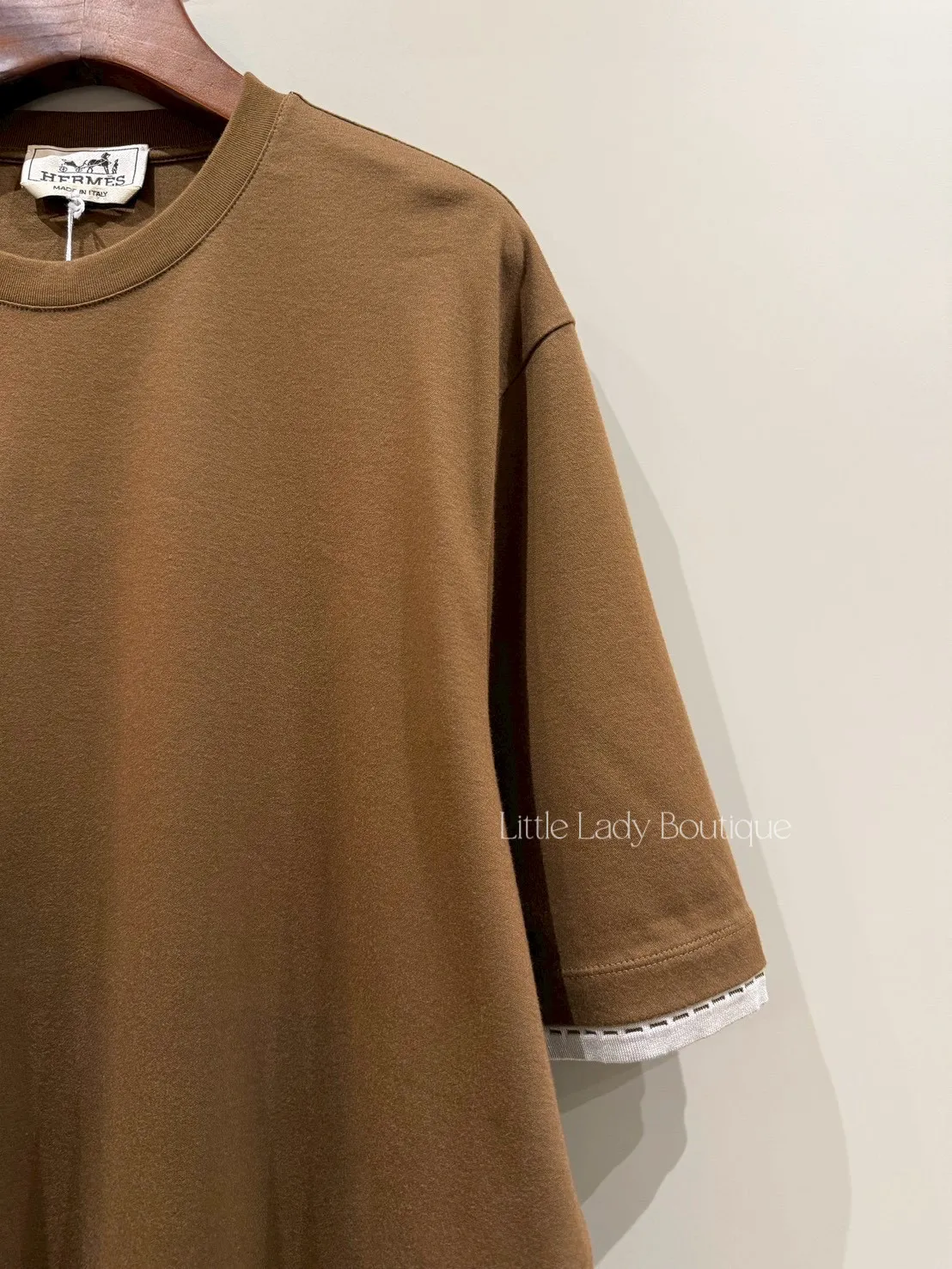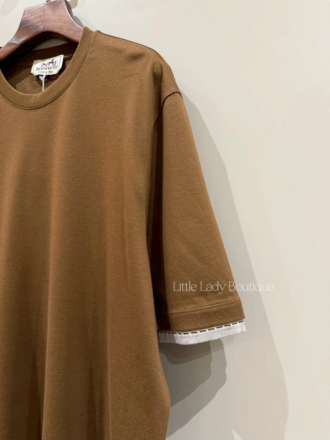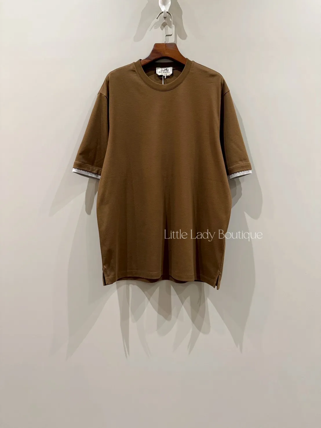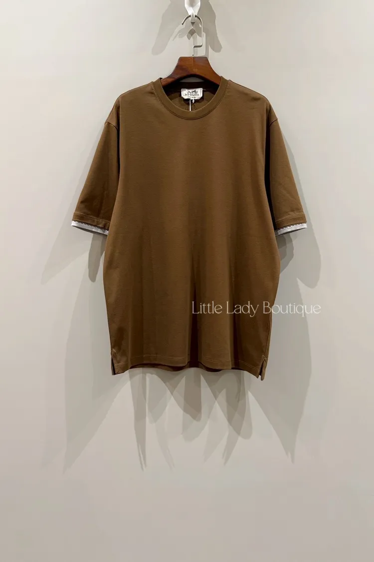 S號 HERMES 男士 焦糖咖色 袖口灰色縫線細節 圓領短袖上衣(100%棉)